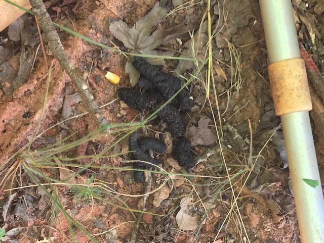 While taking a stroll today around our lake we stumbled upon this pile of scat. We know we have black bear as well as racoons in this area, but would like an opinion on which left this pile of scat. We, of course, are hoping it's 'coon, but we well could have either one hanging out here.