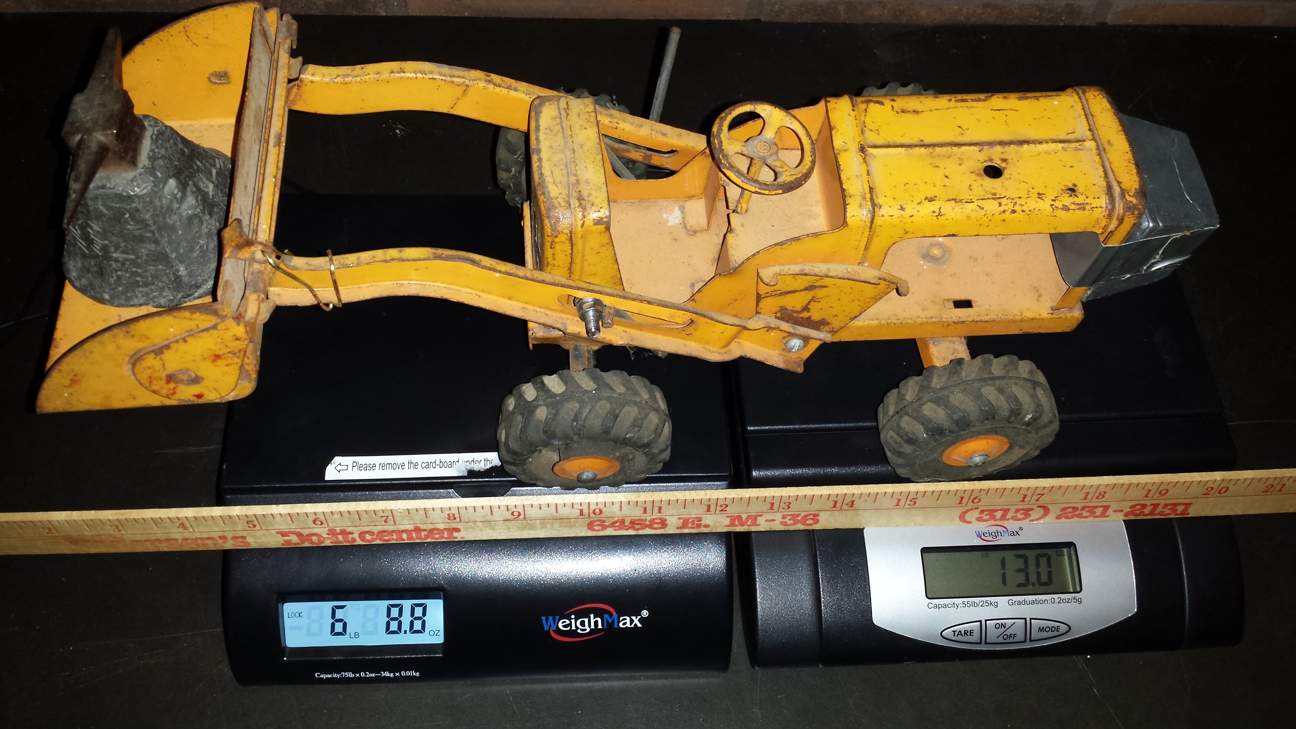 BTW: The use of a toy tractor, some fish weights and a couple of postal scales answers the question posed a while back about loader ballast, wheel loads and bucket position stuff. 20160307_230509.jpg