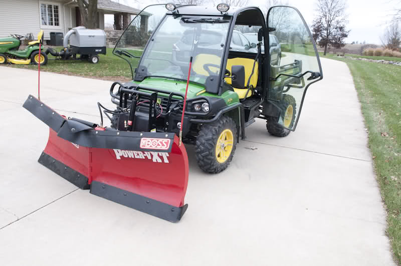 Neither plow is especially heavy and had been mounted on an 825i. The previous owner used about 80 lbs in the Gator bed for traction. I haven't mounted it on my Gator yet. There was one broken weld that needs repair (used plow and the price was quite good, so a minor weld doesn't bother me a bit).