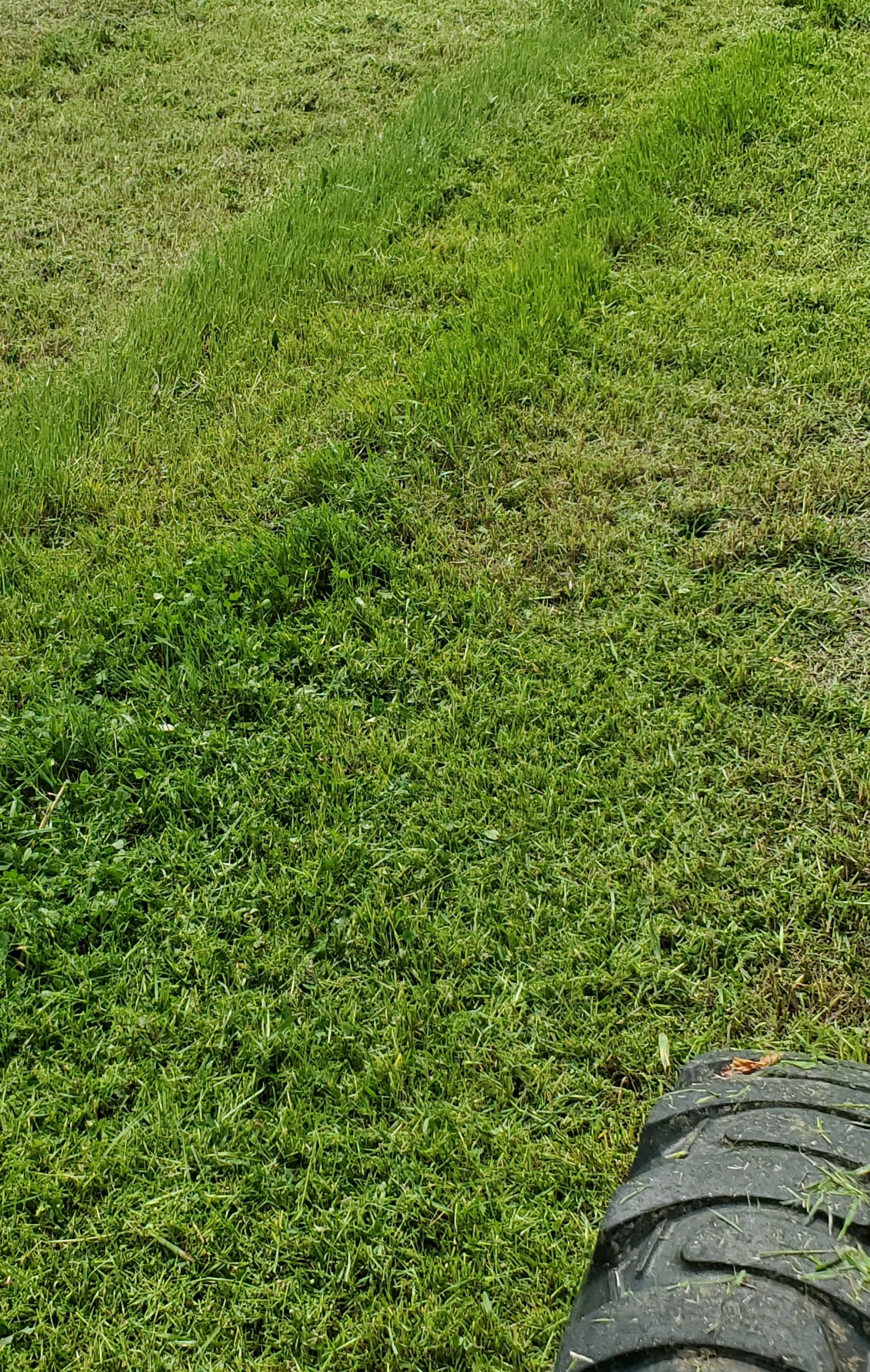 Most of the grass is an old pasture, and is a mix of clover, timothy, fescue, and weeds. The finish mower would leave noticeable tire tracks, but only barely. With the flail mower, the tire tracks are several inches higher, by the time the spring back up, the next day. Its a little bit better in the straight fescue, closer to the house, but still leaves noticeable tracks.