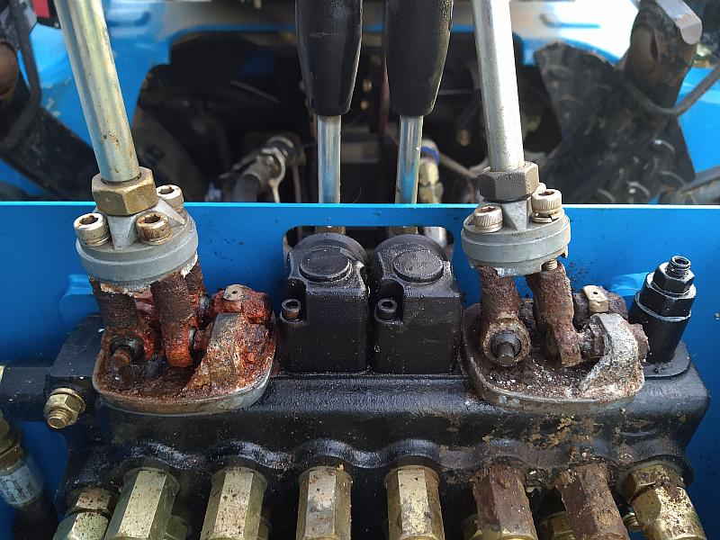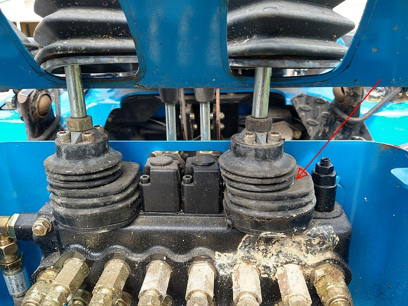 Pulling a few stumps this morning and one of the main joysticks started to loosen up. It still works, just wobbles. I opened the one cover and loosened the top plate and this is what I see. The red arrow points to the wobbley spot. There is a rubber boot covering whatever's under there and it's held by a tywrap.