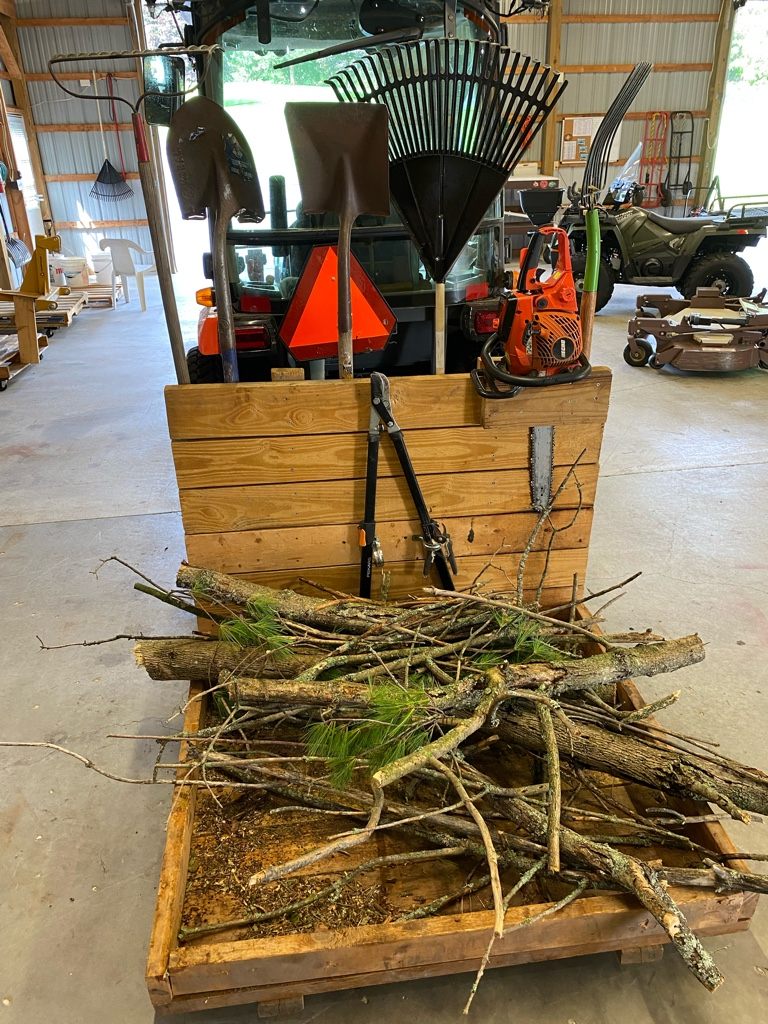I was hoping you didn't notice. That was the splintered tip of a good sized cherry limb that sheered off during a big wind. Of course they never fall where you want them too - so we just threw a chain around it - wrapped the chain around the receiver ball and pulled it on out where we could get ahold of it. Remember the old saying that diesel fuel is cheaper than pork chops.