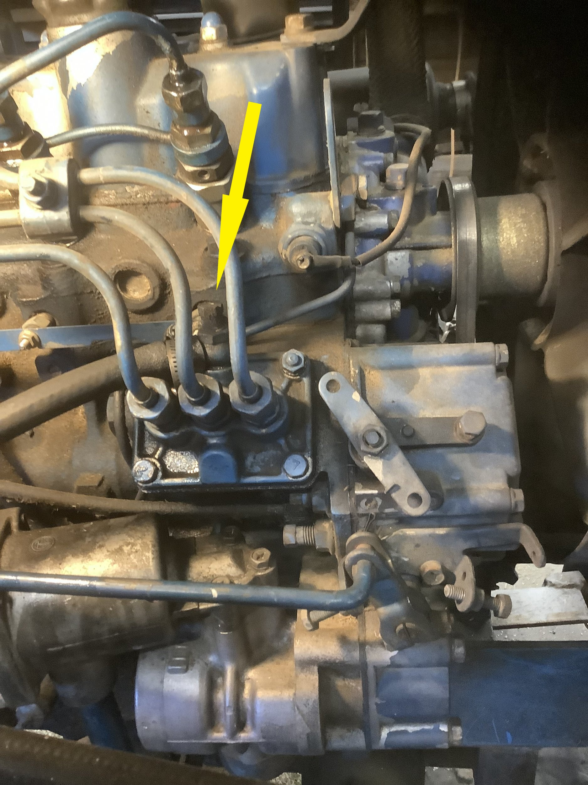 I changed the filter in the sediment bowl, and it wouldn't start. Cleaned the old filter and it started right up--go figure. Had to fiddle with the shut-off valve on the sediment bowl, it started instantly, then died. Now it won't start, but it wants to--it is definitely getting fuel from the tank. I assume the system needs bleeding. That hasn't been necessary for 30 years. My IT manual describes the process, but the photo identifying the bleed screw isn't the same as my engine. In this photo of mine, can someone point out the bleed screw. I assume it is either the screw on top of the incoming fuel line shown between #1 and #2 high pressure lines, or the screw behind the throttle rod. Thanks in advance.
