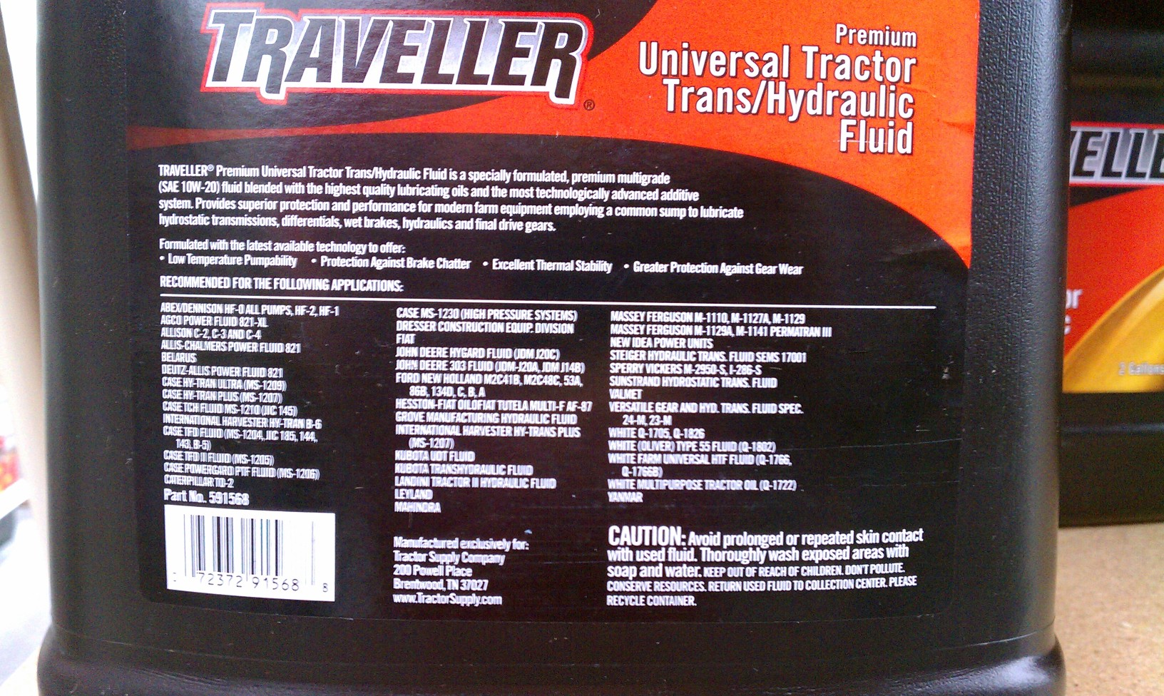 I'm using the Super tech Heavy duty universal fluid sold at Wal Mart... I paid about 90 bucks for two five gallon containers with easy pour spouts. I poured the fluid into a 1 gallon juice container and then into the tractor using a funnel.