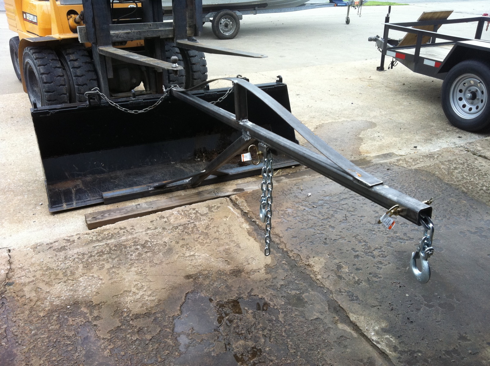 I also have a 10' insert out of 1-1/2" x 2-1/2" tube that I can use for a extension. This will easily pick up a 800lb 20+ft long power pole. The tractor will pick it up but will not curl it, so I have to be careful not to overload the curl,rollback cylinders. It was only about 4 hours to build, took longer to prep,prime and paint than it did to build. About $300 in steel and $75 for paint,hook and chain. CJ