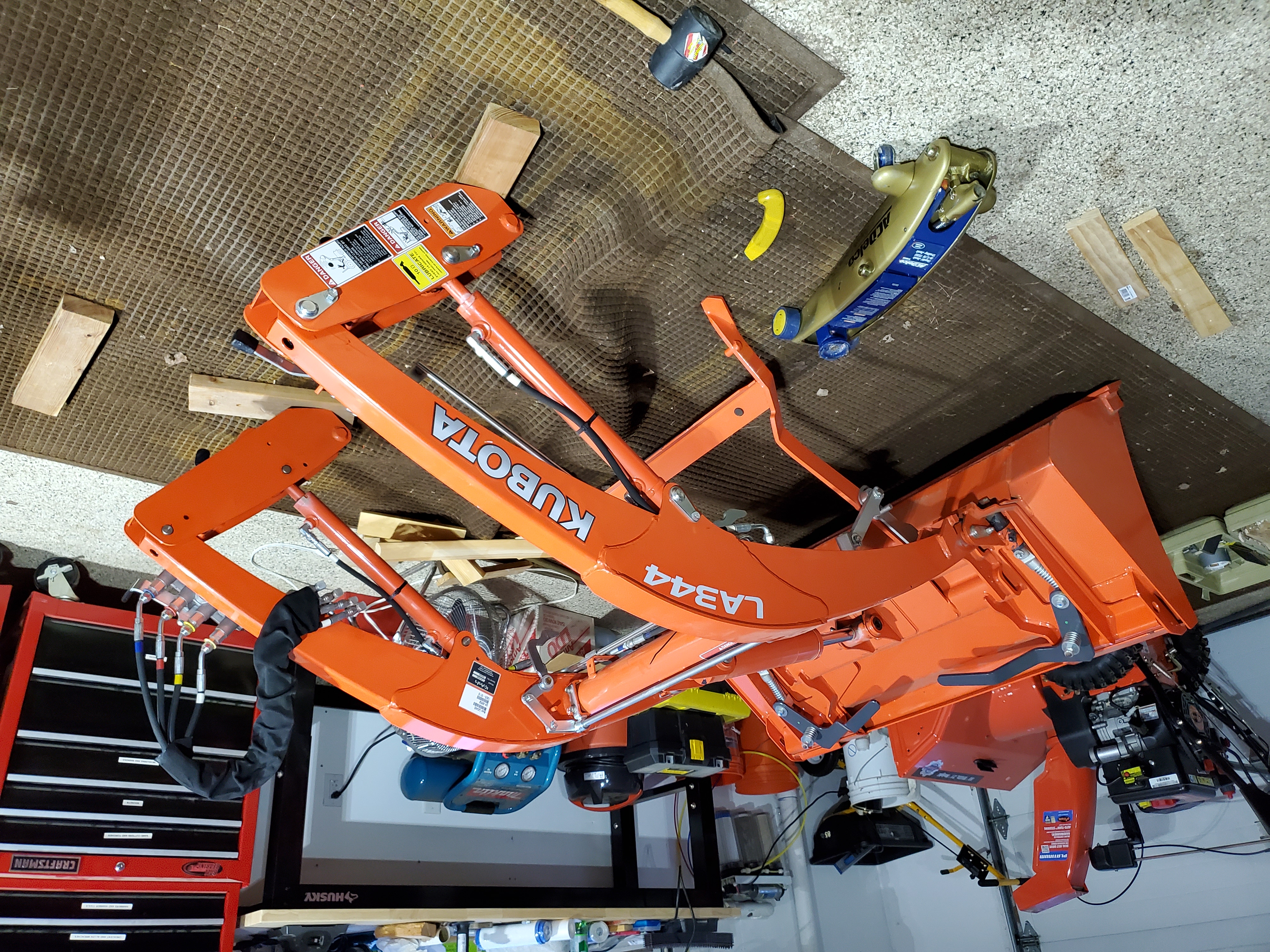 Okay, you're probably all still anticipating the outcome. As you may recall, the nearest dealer said they would call me back within a week to let me know when they would come out. The dealer is [REDACTED]. Nobody ever called back, which is pretty par for the course in this armpit of the world, but I was annoyed nonetheless. So I decided to wait until a nice day (today was the first one that I did not have to work). I could have used the snowblower, if I needed it, and I did once. FWIW, it snowed several inches here this past Sunday night. Since it was near 70F and dry today, I could leave the garage doors open, for the space and ventilation, and if I screwed up, I can yield my side of the garage to the wife and just park in the driveway, without having to worry about winter anymore. I used a floor jack to lift it up enough to slide some cardboard underneath the pressure points and just slid it around by brute force and pulled up along side of it. Flattened out the bucket as suggested which gave me enough leverage to life the arms up by myself and deploy the stand. Got the other truck out of the garage and mounted it on the tractor then went and fixed some of the potholes in the private road. It probably took an hour or two, altogether, to get it back on, but if you include all of the time I spent just looking at it and thinking about it, it was a lot more than that. A neighbor would have helped, if I asked, more than likely, but I'm a child in this neighborhood at fifty years old, and I did not want to send anyone to intensive care. I do appreciate all of the genuine helpful suggestions here, and I apologize for my lack of participation, but I was pretty ticked off for a while and needed some time in denial.