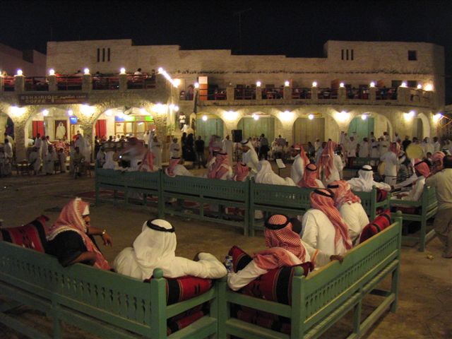 I ran into a classmate of mine from Quartermaster school who was stationed there at As Saliyah and he took us out two nights. We went to the Gold Souqs. Souqs is their word for shop. Most of the gold they sold was 21 or 23 karat. Hanging in the windows was what looked like Mr. T starter sets. No matter how ornate the designs were, the pieces were sold based on weight. We left there and went to the ghanim which is the old market place. Some of the areas looked like scenes from "Raiders of the Lost Ark". Here you could find hand made crafts from all over the middle east, mostly from Iran. There were also vendors who sold spices by the scoop or cinnamon by the stick. There is a restaurant in that area that hosted an outdoor concert. It is really something to see that many men in white robes dancing an Arab jig.
