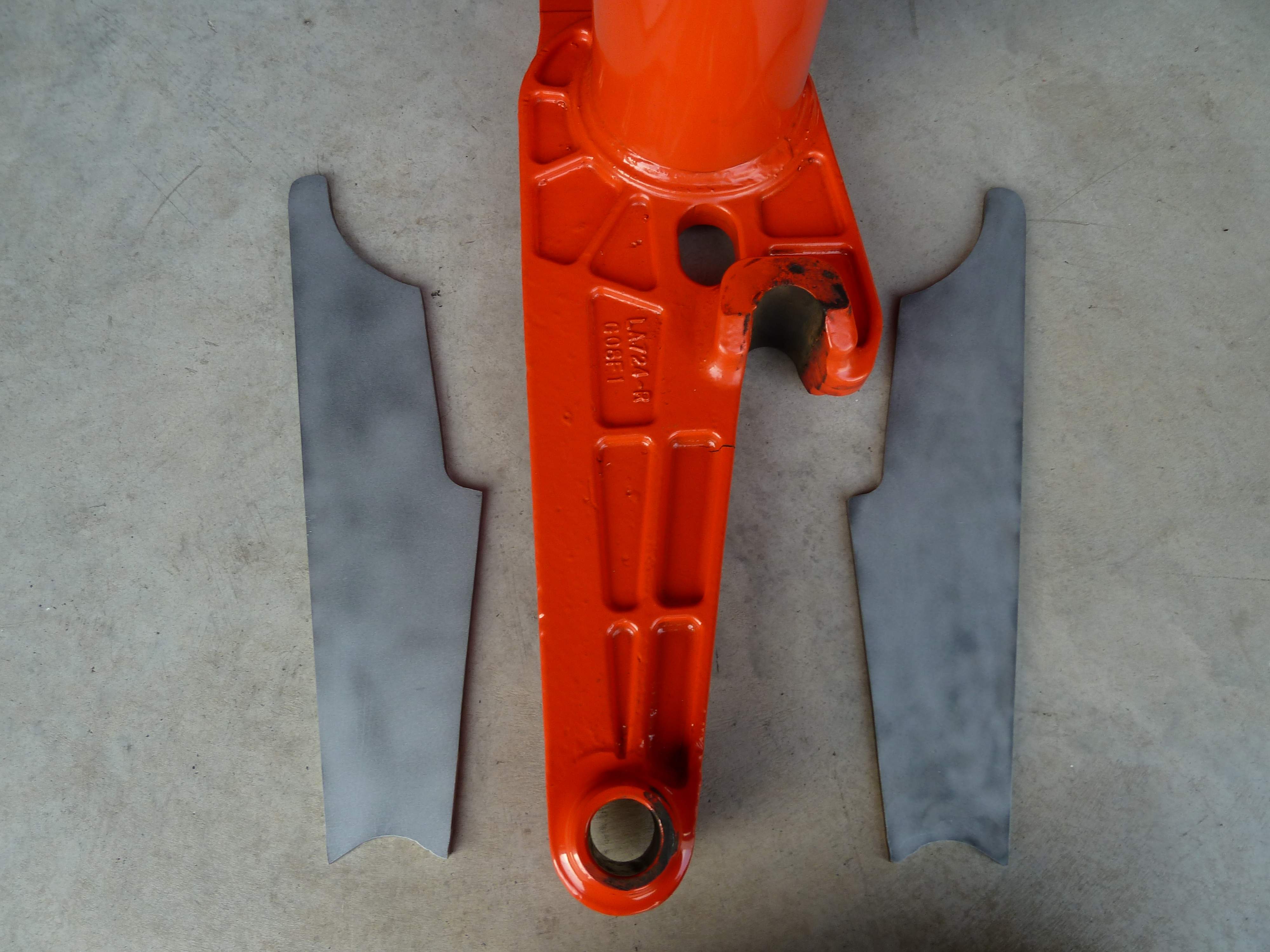 of the bracket,mine only has two.The third area is full thickness from top down quite a distance.It appears there was a slight change in the casting process to compensate for the lack of a welded reinforcing plate.Whether this is good or bad is debatable,I personally would prefer to see the casting process removed entirely from the fabrication of these brackets but I assume it is due to cost efficiency.I have added a couple of photos to help clarify.One shows the pattern of the webbing with the plates laying beside it that I have made to reinforce the bracket.The other shows how the plate will fit on the webbing side,it will be the same on the other side.I plan to reinforce the other bracket the same.