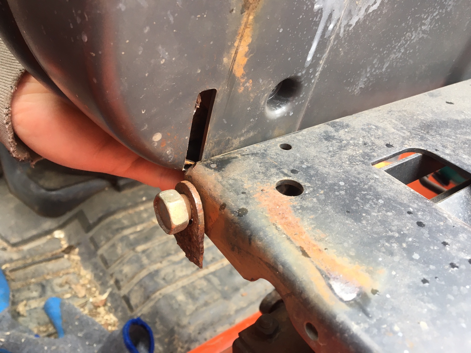 The seat pan should unfasten from the base giving you access to the hinge. BTW that looks like corrosion wear not only just 'rust'. Either weld with a patch or new bracket. If patched, you might have to carve out a wider slot, but I wouldn't call that a 'major'. The other side is probably ready to fail, too.