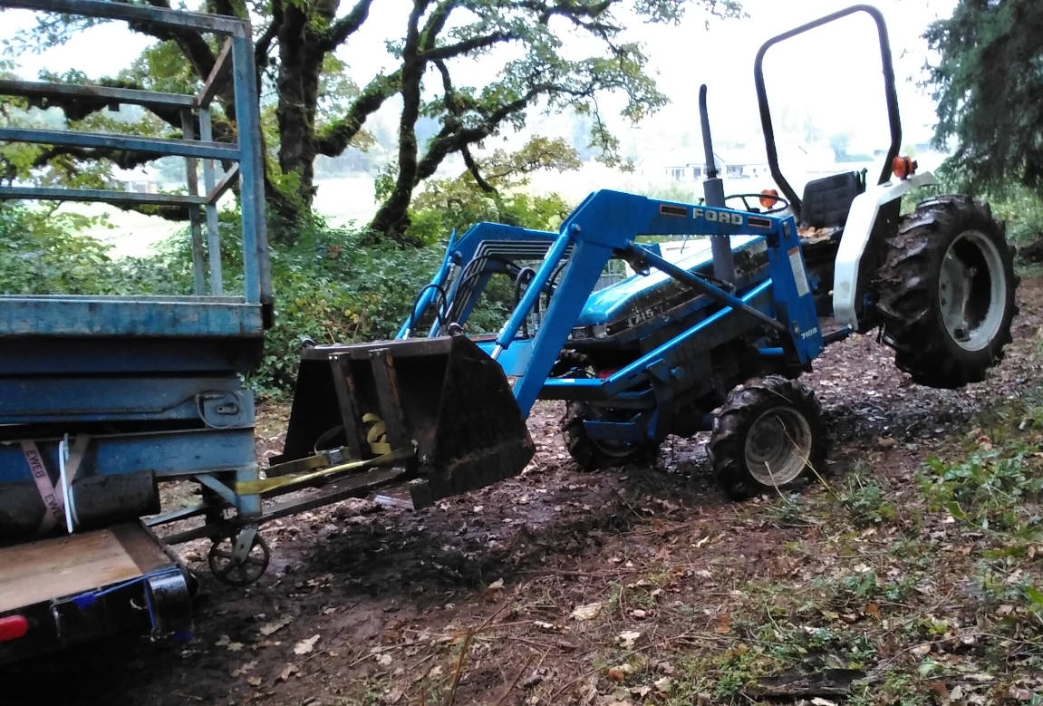 In the picture with the Ford, I was pulling a scissor lift off of a trailer, and had forgotten to add ballast back on the tractor after putting the draw bar on earlier. So, when I pulled the lift past the end of the trailer, I got a lot more weight added to the bucket and wheels came up.