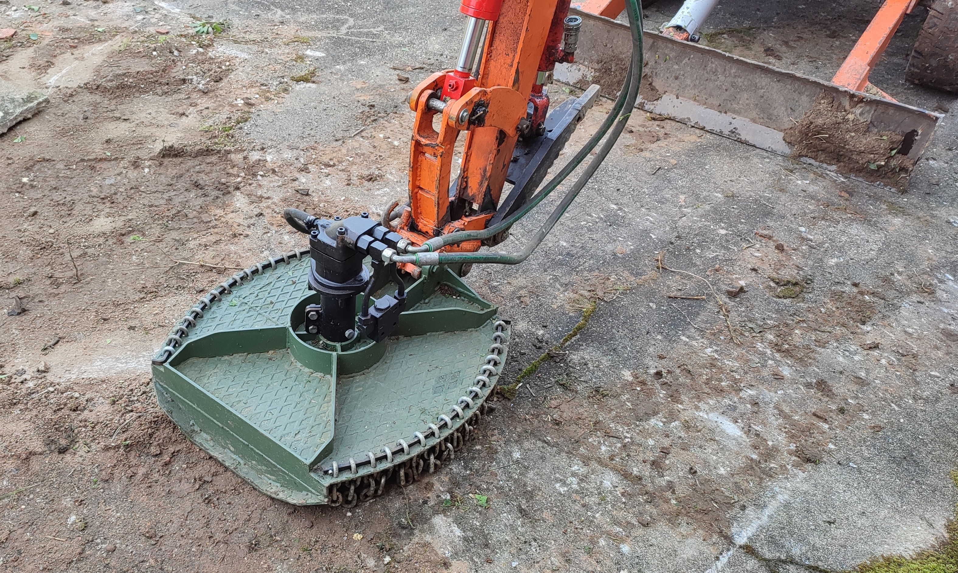 Here is an hydraulic brush cutter I built for my backhoe a month or so ago. I suppose it fits the thread, since mostly about using chains. I do have a flail mower for the backhoe, which worked fairly well, but it's just an heavy attachment and I wanted something lighter.