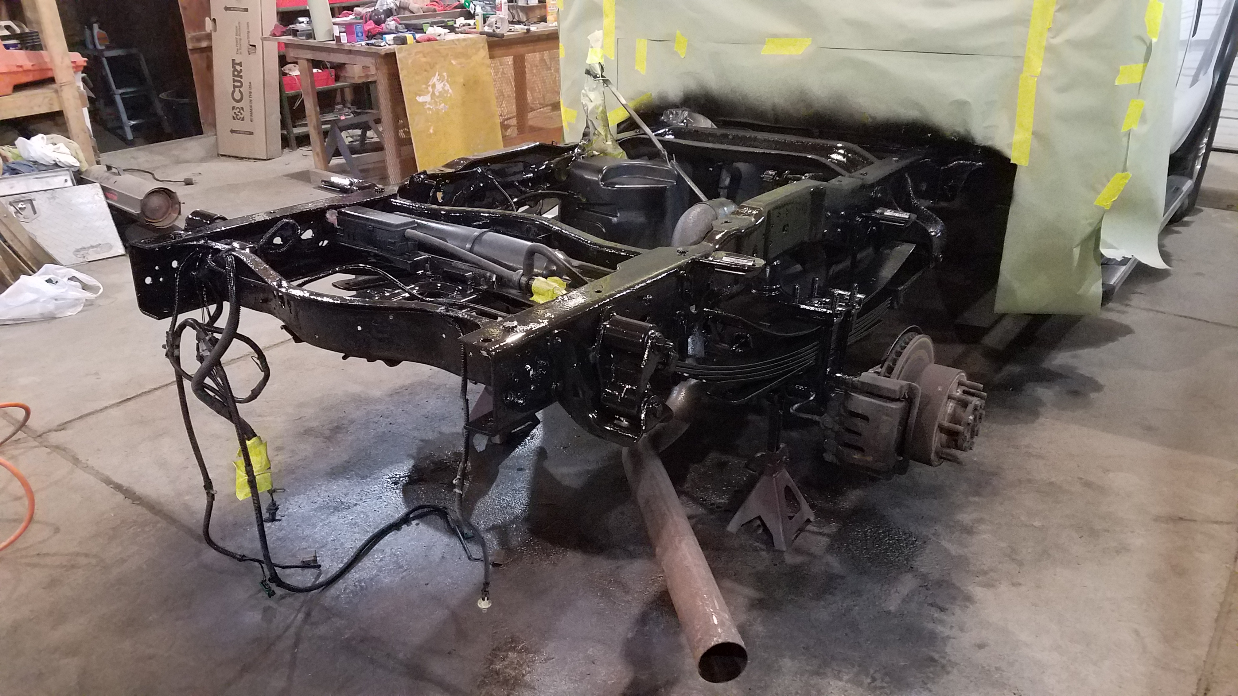 Finally able to prep the frame (sanded, powerwash'ed, etc) and paint it. New shocks going on and servicing the rear axle when the paint dries...