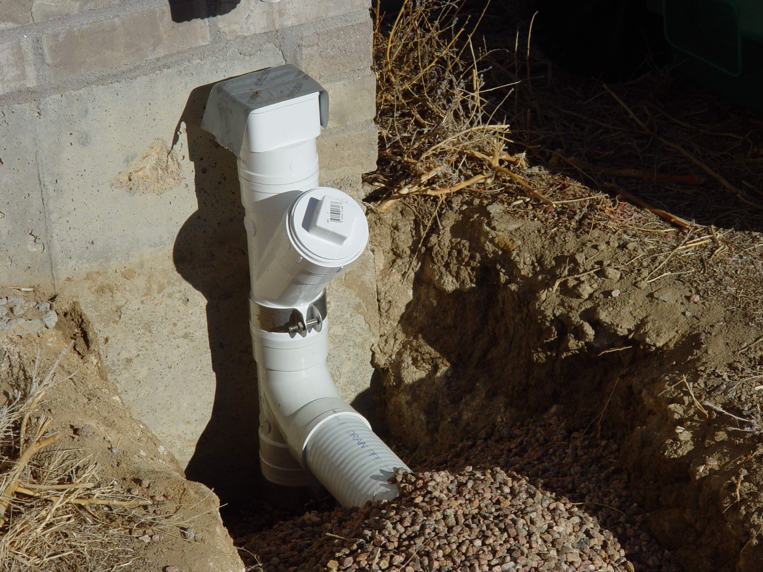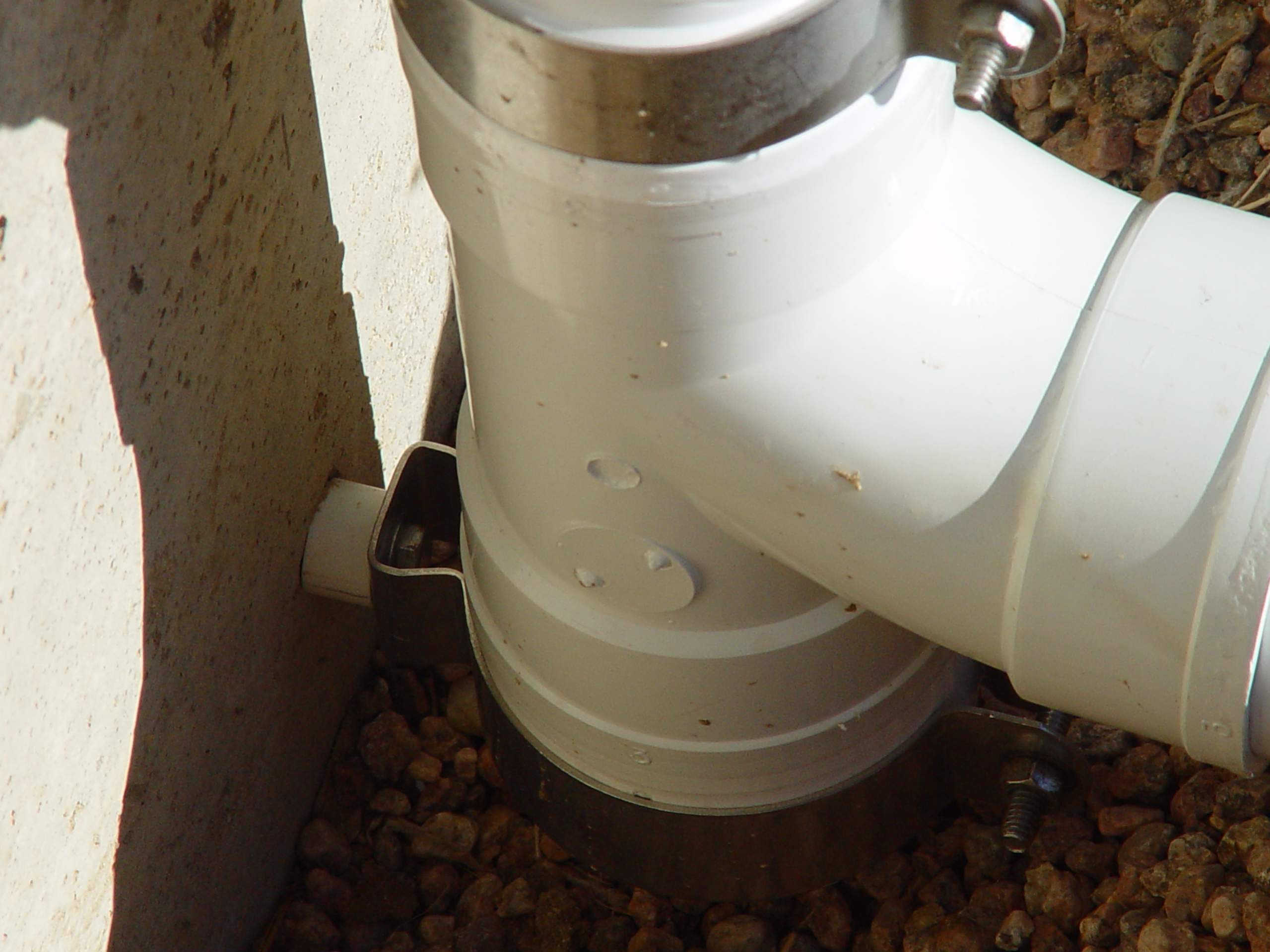 If you don't glue the rectangular to round transition piece to the top of your soil pipe it is very easy to unscrew the downspout screws from the hangers and remove the downspout for a more direct access to the elbow in the ground below it without any visible Y stub sticking out from, or against the wall at ground level. The 3 tight elbows under the Y fitting shown in the picture of, I think Obed's house, is just designing in a big clog area. All those sharp corners could have been eliminated by using two 45 degree joints with a piece of straight between them, making the Y clean out superfluous and the natural flow a lot better. When the final grade fill is done a lot less pipe is exposed than having a Y sticking up above the soil. On a one story house all the downspout holding screws are usually reachable from a step ladder. If the ones at the gutter hole stub are hard to reach you can just leave them out as the diagonal run of the downspout will hold it in place.