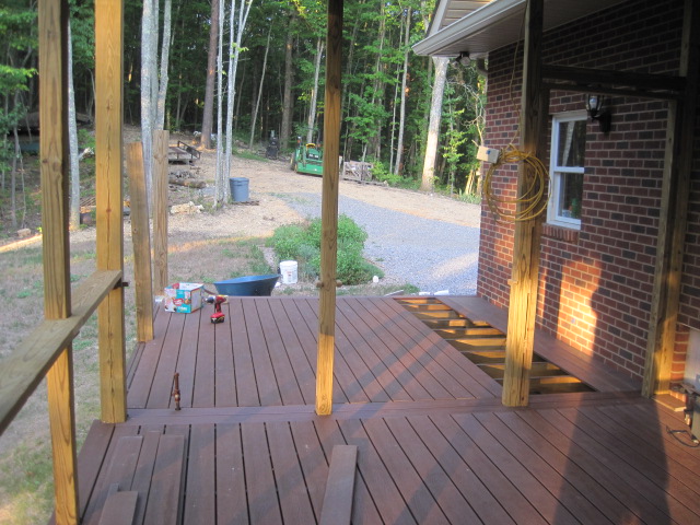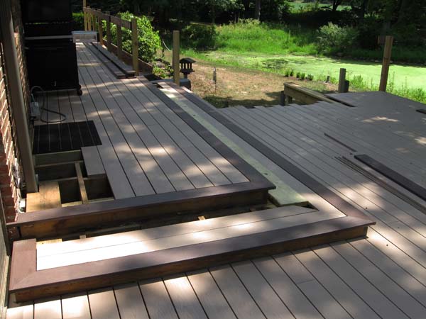 We picture framed our deck. It added a lot of time to the installation but does hide the exposed ends of the composite decking.Checking this thread out again, I noticed the issue on the exposed ends of the deck. I'm sure the builder will make it look OK with added trim boards, but for anyone else doing a composite deck, consider "picture framing" it. This is what my contractor did with my Azek deck and it really worked well. It has a slight overhang on all sides. The attached photo shows steps on the deck. We used a contrasting color to give a "visual cue" for safety.