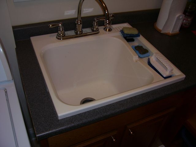 The bad news is that the 19x19x10 sink for the mud room would not fit in the standard counter top depth, so a last minute call was made at 8:35 for the builder to run to Lowe's and pick up the next smaller size. He barely made it there before closing, and returned with a 14x14x6 bar sink. So that's what was cut out and installed. Not sure how useful that will be as a mud room sink. The other issue with this sink is that it is a 2 hole, not a 3 hole which is the Delta faucet that was purchased for this location. Hopefully the plumber will be able to cut the sink for 3 holes.