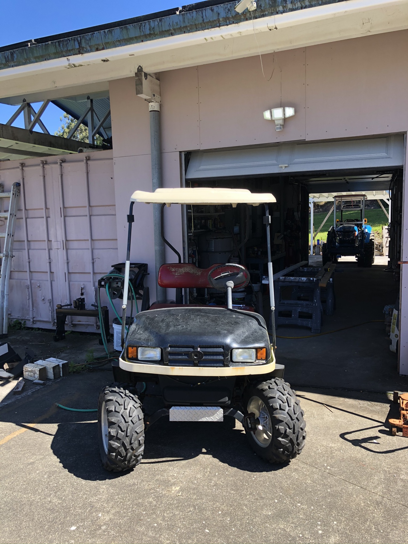 Ezgo top is tied to tractor right now awaiting next step. Will take off tomorrow and figure approach for the frame.