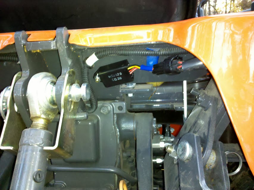 I had moved my lift arm on the right side up even further and zip tied it in place. I was having problems with the lift arms interfering with the tow behind trac vac I was using to pick up leaves. The lift arm had been shoved into the small box/relay and crushed it. 65 dollars and 20 minutes later I was back in business. I had managed to rig my neutral safety switch so I could drive while the safety switch thought I was still in neutral.