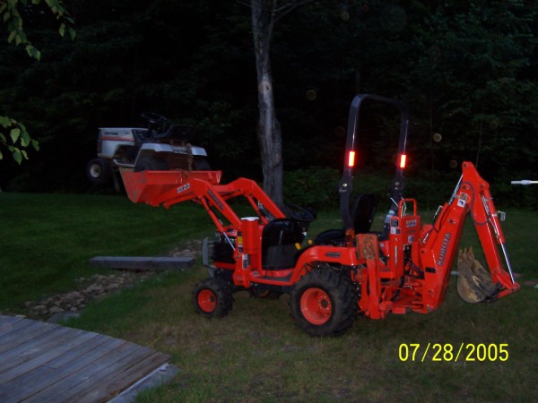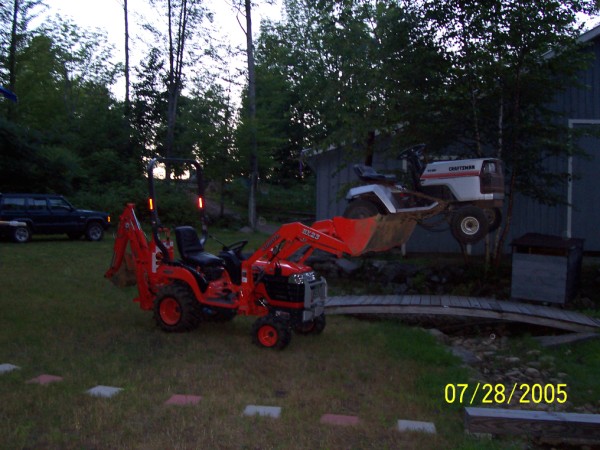 I built it out of some really crooked maple beams i found at the lumber company,i work at,and some 1inch pt.yes it does support the 23,although it does flex a bit.you can build one using 2by 12s cut "rounded" you will get the same effect..double them up for strength,and keep the beams under the tires.i usually cross on the rocks in the summer,but use the bridge in the winter,because this is where i cross with the snowblower.the other bridge on the right is a 6by 12 we use as a footpath to get to our pool.HERES A GOOD ANGLE OF THE BRIDGE