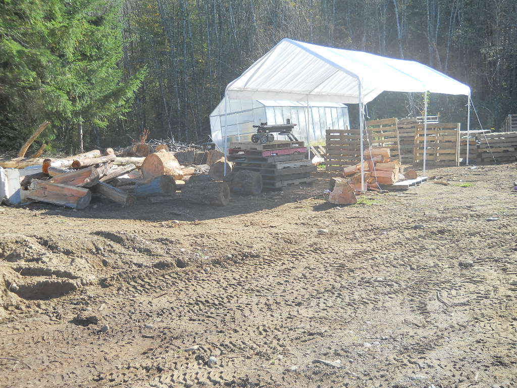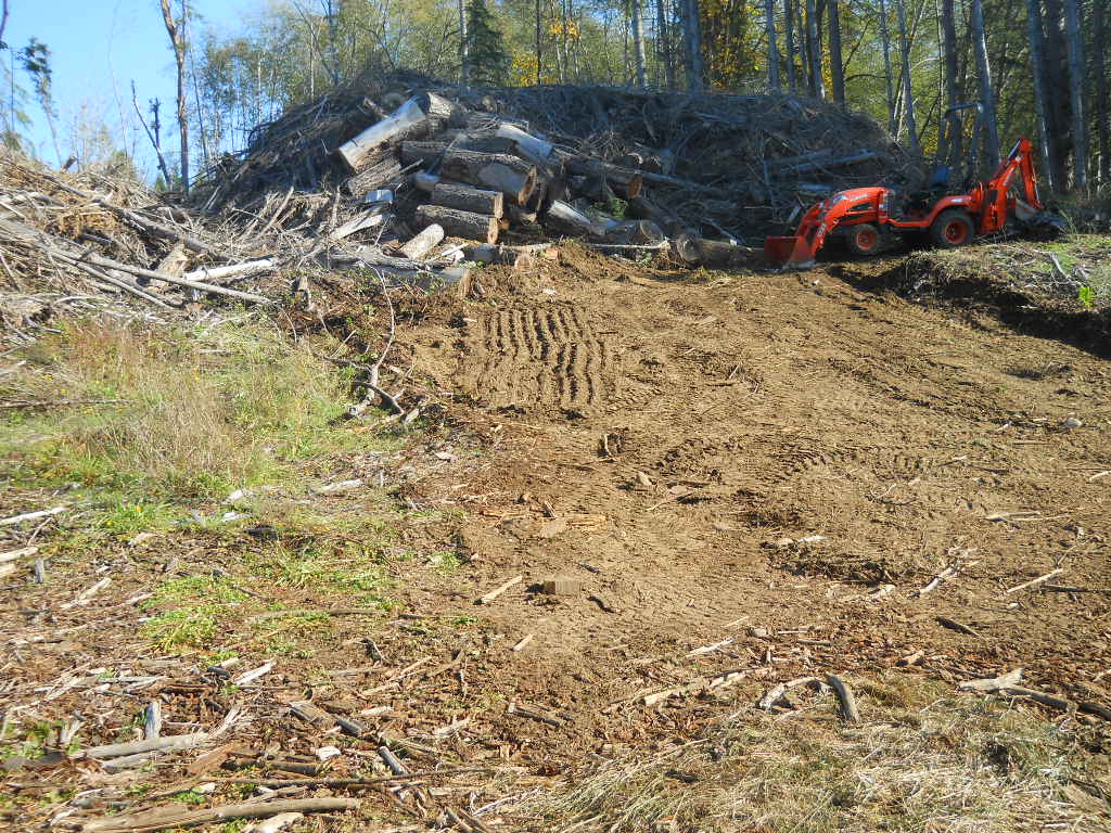I am working the slash piles left from logging 15 Ac of timber to make firewood to sell. 20 cord to date and that much or more to go. They left two large piles where they set up the processor on either side of the creek; 59 truckloads and many of them over 100K weight. I am putting my BX 25 to the test sorting the largest pile which is on a slope, so had to excavate a level area next to the pile to work from. Quickly learned to move very slowly on the slopes. I use the BH as moving ballast on the up slope side. That means moving it a lot. Some pieces I carry down whole to the wood lot and others just roll to the bottom and then pick up.
