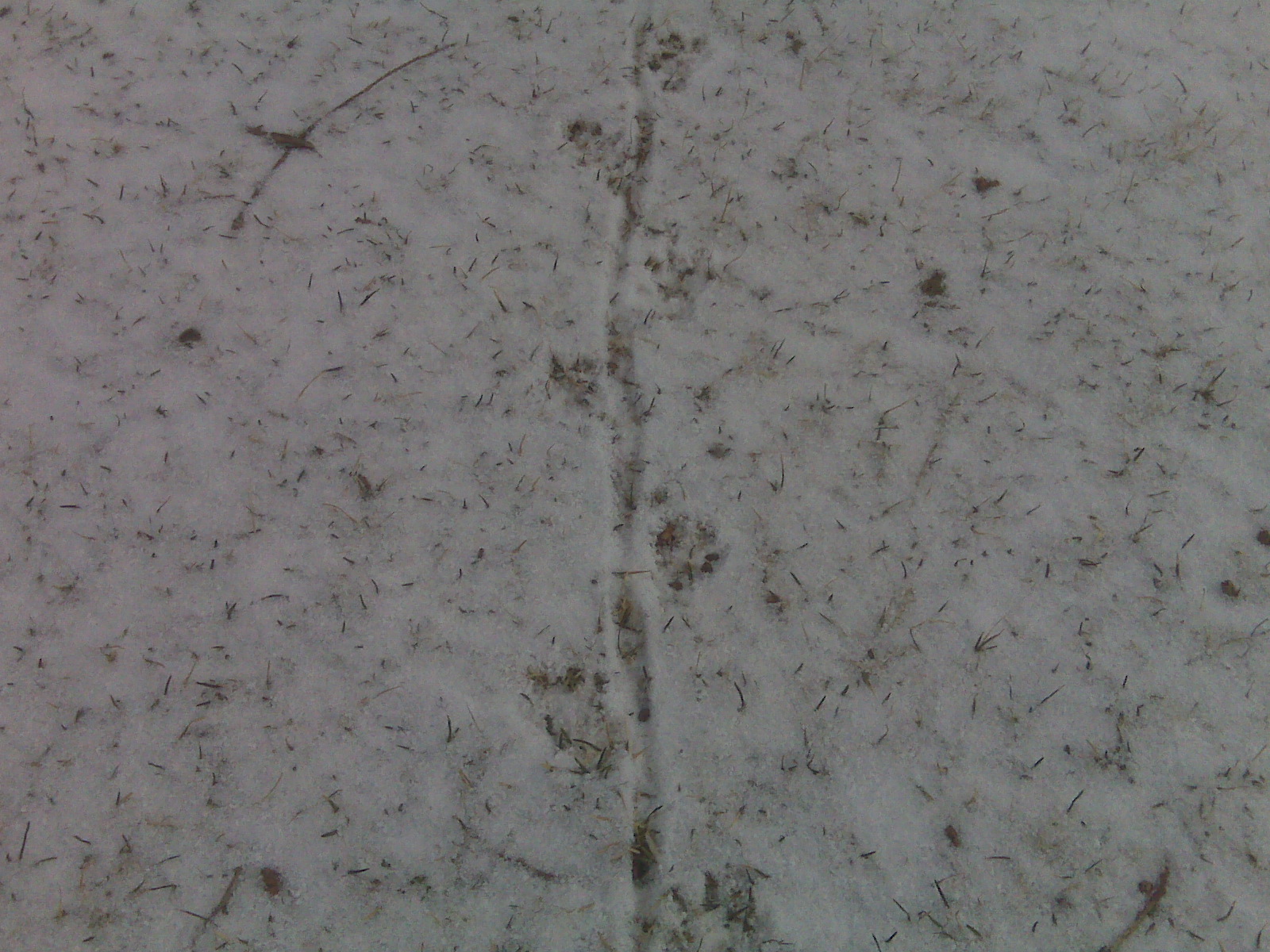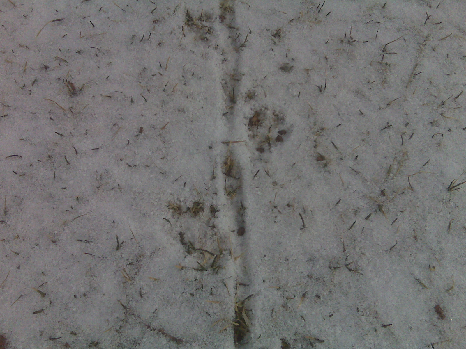 There was a dusting of snow overnight, and about a half hour ago I went out to the road for the newspaper and spotted these weird tracks. Not much snow, so not much detail, but the paw prints are a little bigger than the plastic screw on top of a gallon milk jug, and seven inches between the prints on each side of the groove. I am thinking a possum dragging it's tail?