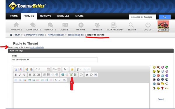 On my computer I double click "Reply" or double click "+Reply to Thread", then put the cursor where I want the picture and click the "Insert Image" icon.