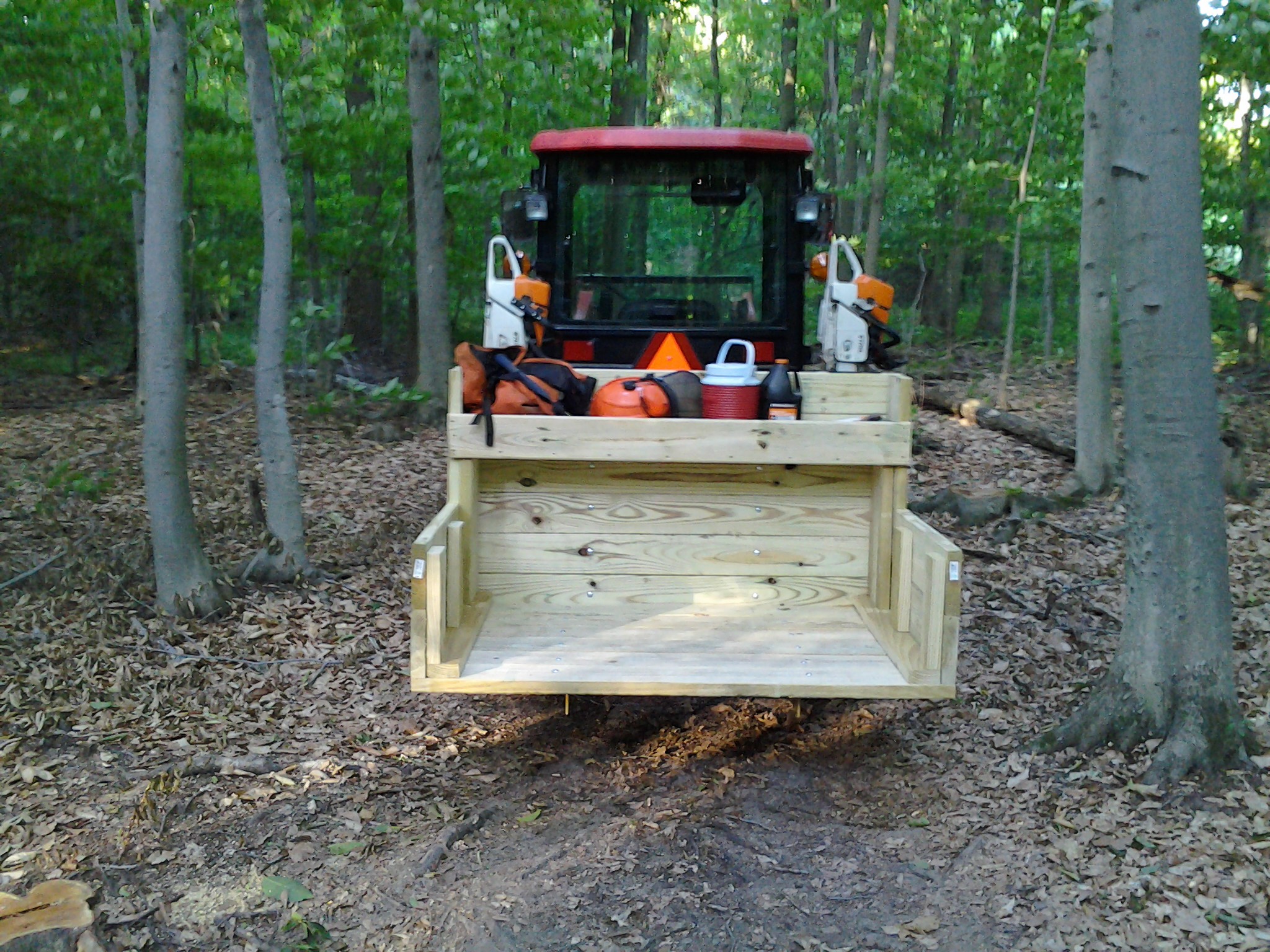 I use the forks to carry several oversize pallets that have a sheet of plywood added. For the one I use mostly, I added a backboard on its front edge so I have something to tie cargo to. Another has high sides for a portable mulch bin, and a third has uprights along its back edge, for storing and then carrying a load of short tree props into the orchard.