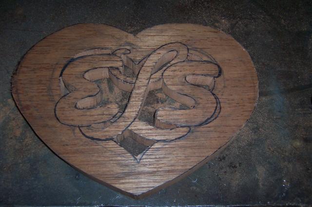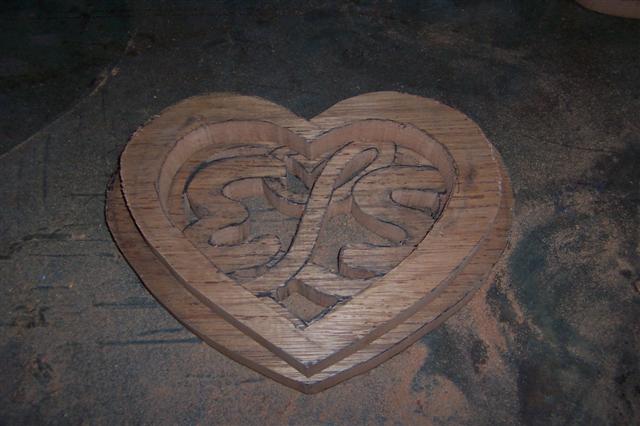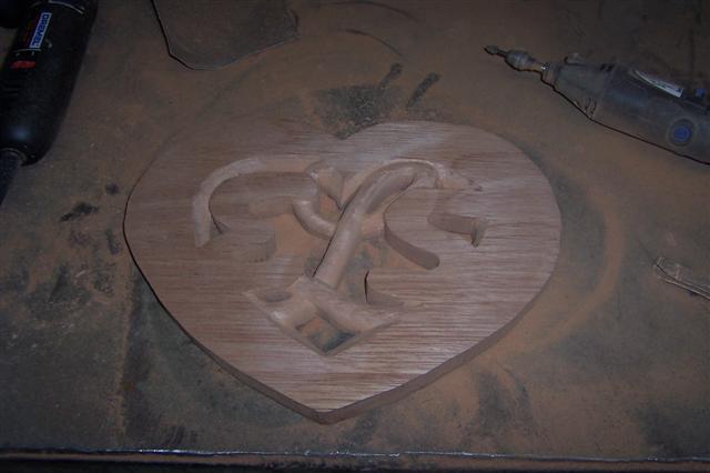 I cut out the wood that wasn't supposed to be there to leave the letters and shape of the heart. I also cut the other piece to the shape and size of the heart, but smaller. It will add depth to the heart when it's done.