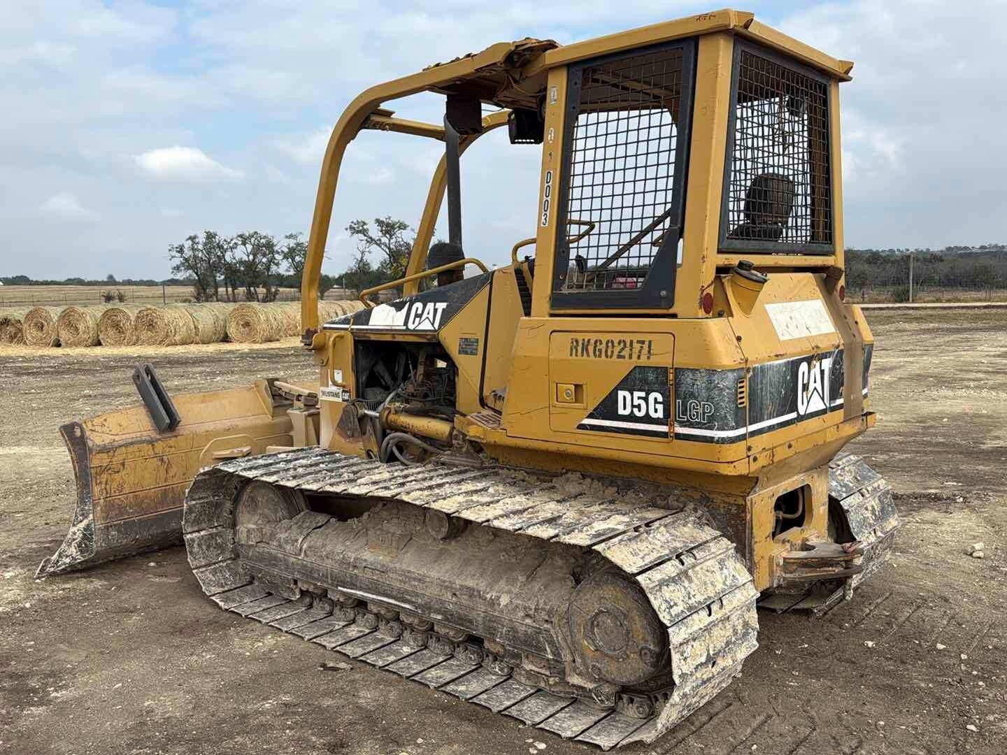 (Comfort. TX) CAT D5G LGP DOZER VIN/SN: CAT00D5GPRKG02171, ENGINE: CATERPILLAR 5.0 LITER/99HP, METER READS 722HRS, ENGINE STARTS: YES, TRANSMISSION: THREE SPEED FORWARD/REVERSE, OPEN ROP, SIX WAY BLADE, 26IN TRACKS, 10.5FT WIDTH BLADE, ONE HAND DRIVE, ONE HAND BUCKET OPERATION, APPROX OPERATING WEIGHT: 20,435LBS. ITEM# 20123