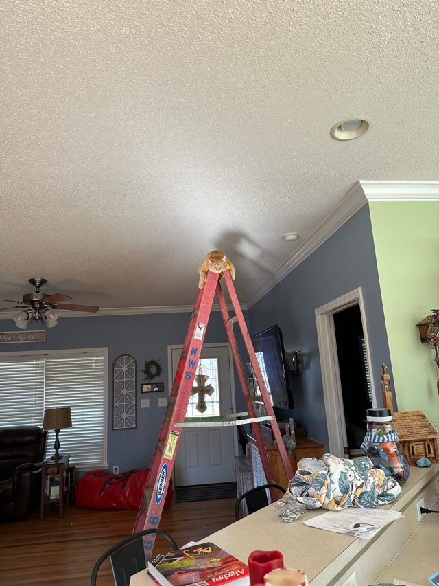 I built this little castle out of cardboard that was laying around after some deliveries. It has 6 levels with a ramp and a loft inside. I started out with duct tape, then added hot glue for the upper levels. They play in the castle more than the store bought cat tree. The favorite spot is lookout, on top.