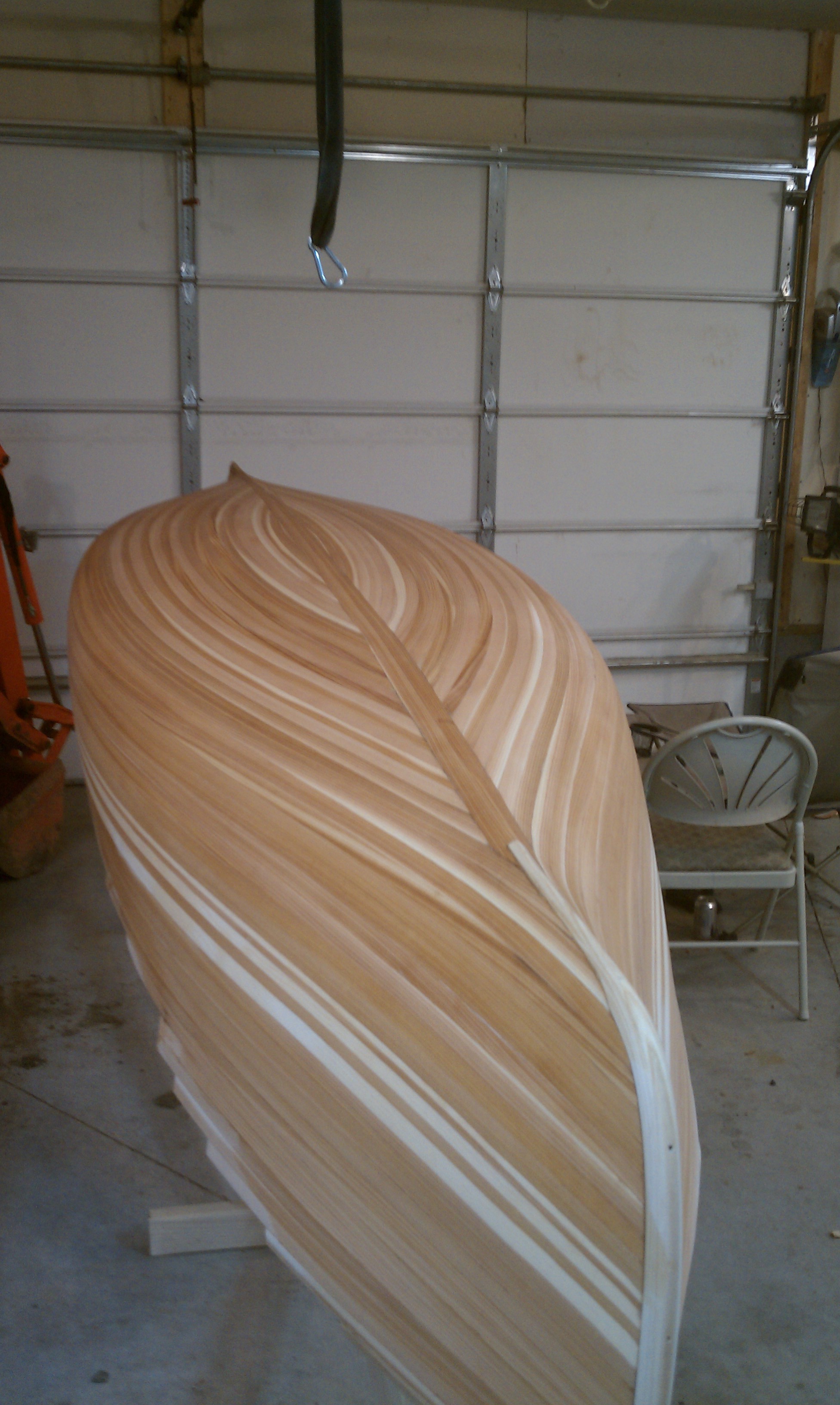 Sorry i havent been on much. I had to put the canoe on the back burner for a while. I am just now getting back into it. I have my epoxy and fiberglass ready to go. I just need a few days to free up so i can apply it. I will add a picture from last night. It shows how the wood should look when the epoxy is on. I wet the hull to look for glue spots. So far I live the colors that i see.IMAG0444.jpg