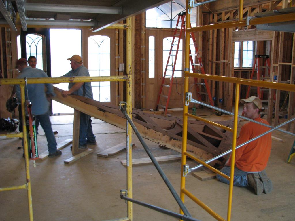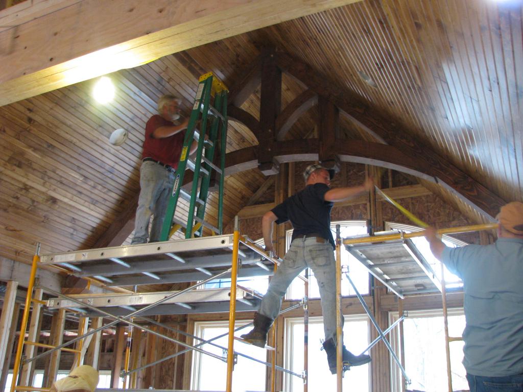 Just thought I would share some photos of our dream home in process. The living room ceiling is done and the trusses are going in. they weigh about 1000# each and we lifted them up with an electric hoist.