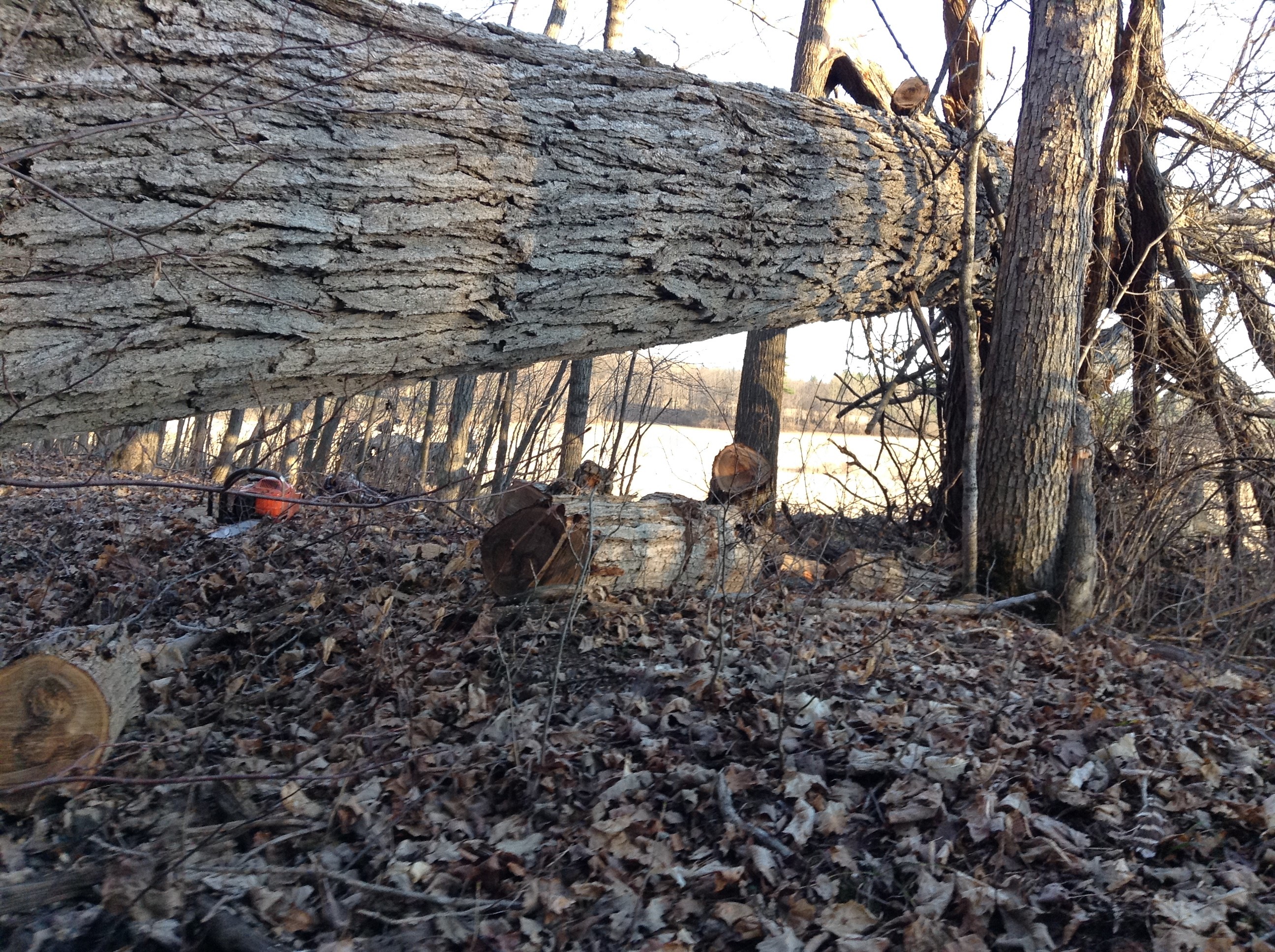 A pretty big tree (elm?) fell over in the field, and from the way it sets, I'm thinking I want a (temporary) bigger/biggest bar on the 57cc to make those ~1/2 dozen cuts on the trunk.