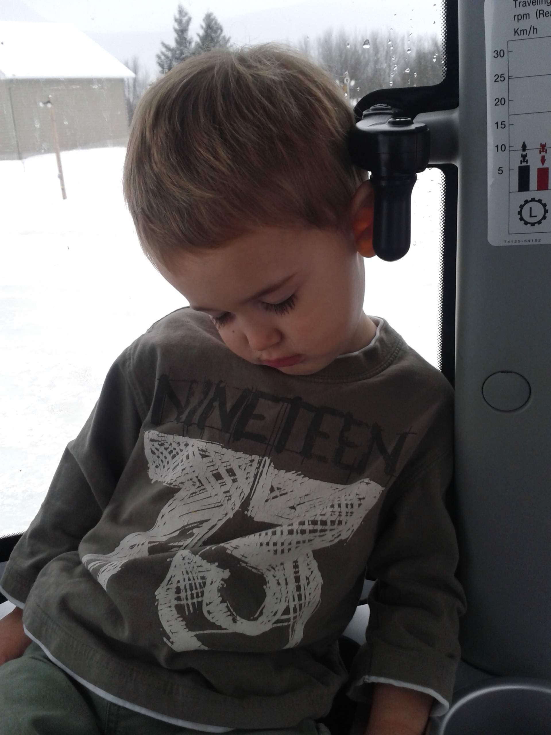 Thanks, apparently he gets more than a little upset in the house if he sees me on the tractor and he didn't get an invite, but almost without fail, he's asleep within ten minutes of getting in.