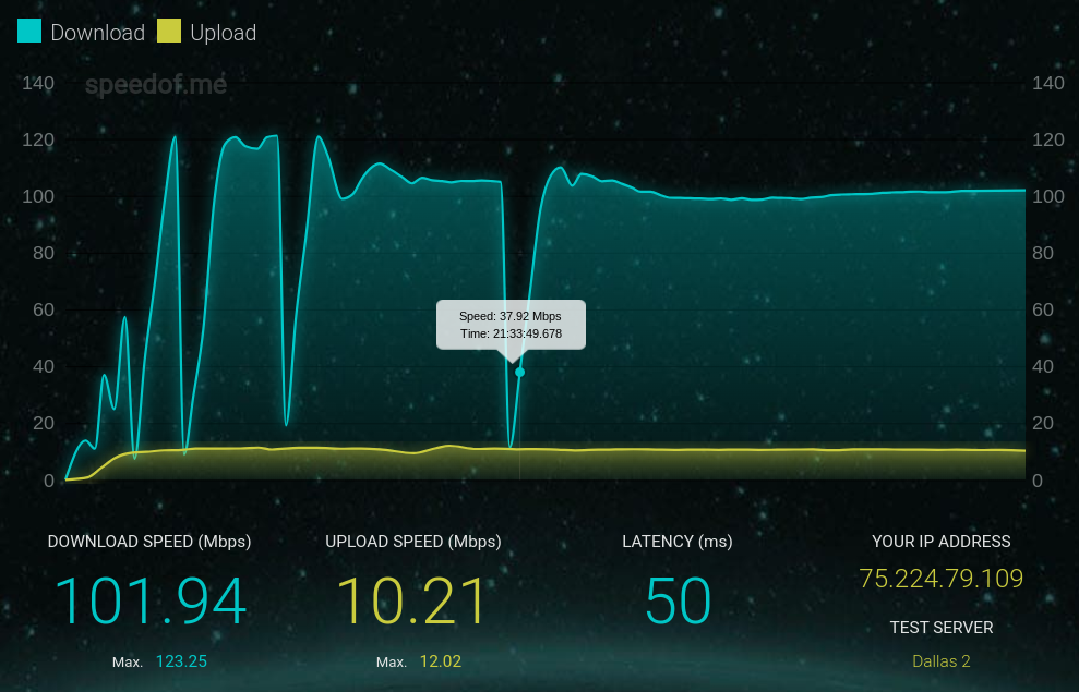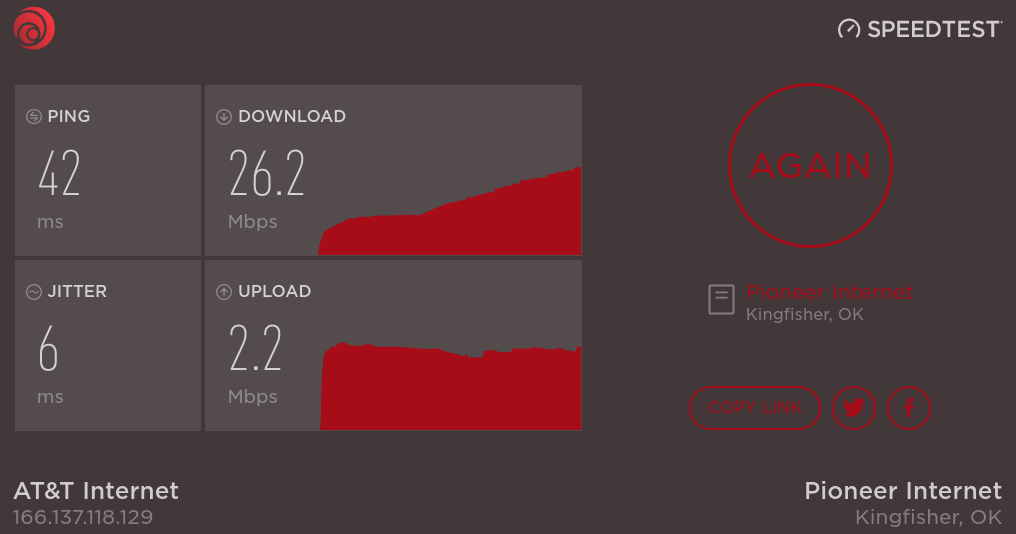 Kinda slow, but faster than Hughes Net in the evening hours. 👍