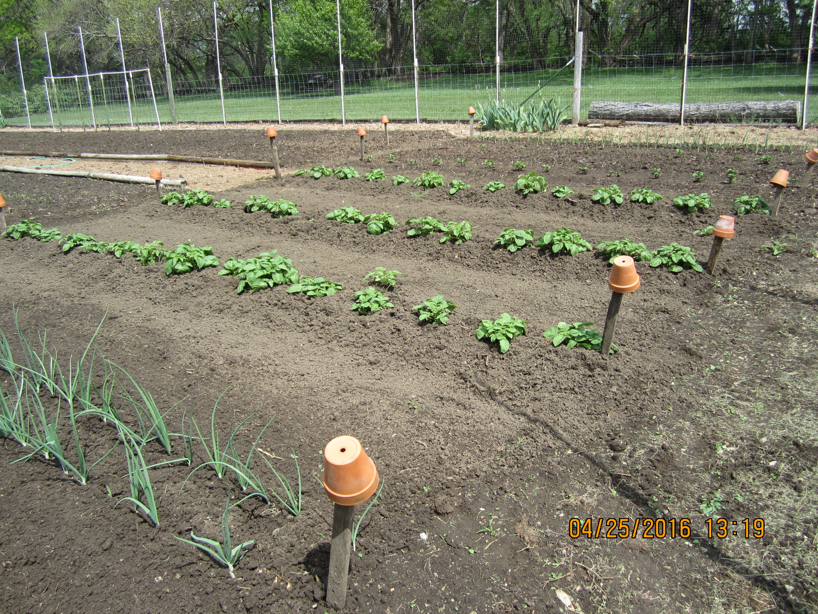 It seems they're a tasty treat for deer, and I suspect, porcupines too. I've tried every type of sent and noise deterant I can think of... and they've failed, so it's time to bite the bullet and build a fence. Seeing as how these rows sit on rock (hence, the raised beds), digging down to set posts isn't realistic. This is also about 500' away from the house on an ATV trail. So, I've built a log perimiter as the base. I had to shorten the rows about 5' in order to line up a big tree on one corner and to allow room to pass between the fence and the end of the rows to get to the outside of them.