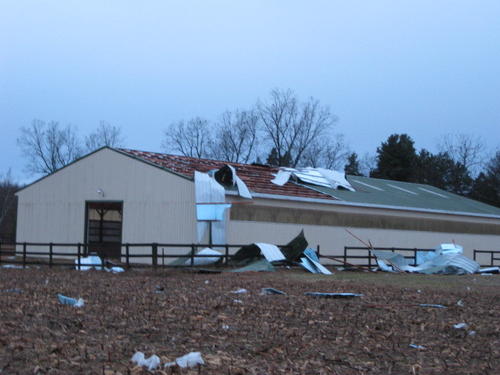 Best I can guess, maybe they had the doors open because of the mild temps, and wind got in and blew the roof off from inside. The building has been here for years, and survived plenty of other storms and hurricanes. This storm came through so fast, and without much warning, I bet nobody had time to get ready on the farm.