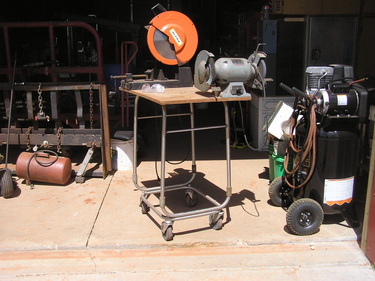 I like your table arrangement for your bench grinder and cold saw. Presumably this is to transport the tools outside so that you don't spray hot iron filings inside your shed when cutting and grinding steel. I am going to fabricate the same design as it looks so simple, effective and cheap (unless you have a patent on it. :)