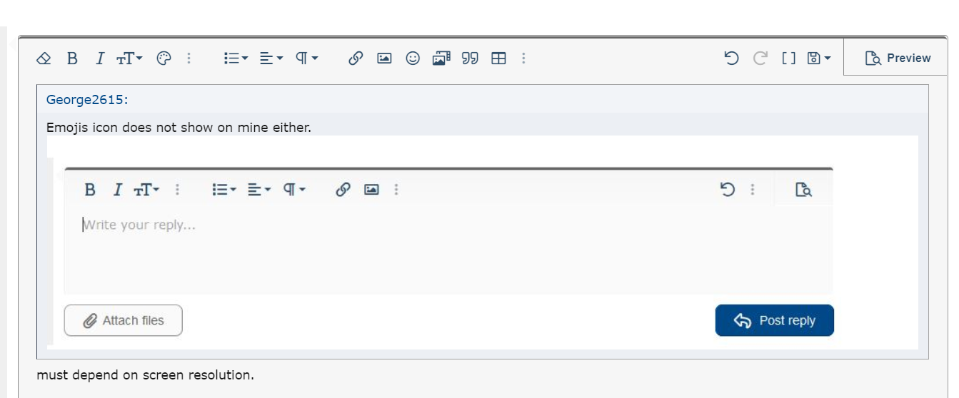 Not screen resolution so much but on the size of the text you set in the browser. Oddly, when I increase the text size, the emoji icon pops out of the middle stacked dots icon/dropdown menu. Seems like it would work the other way; save space on the main menu bar when text is larger by sticking items in sub menu.