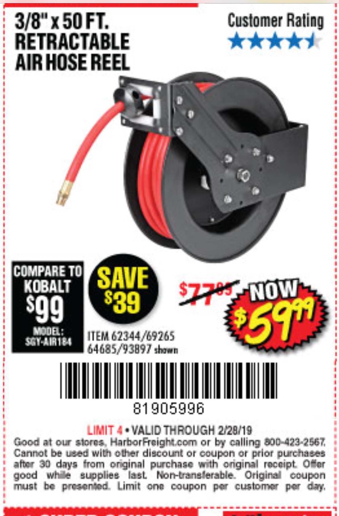 I've got two of the Harbor Freight 50' air hose reels. They go on sale for $60 all the time.