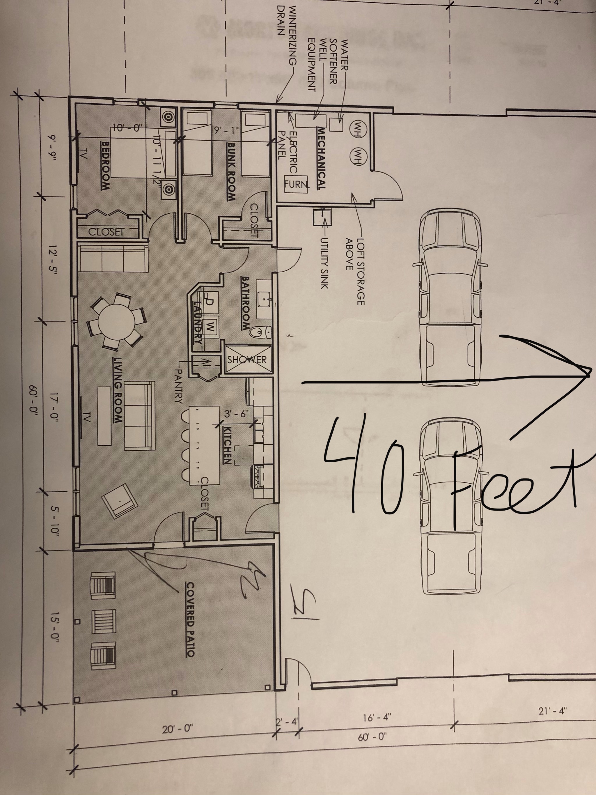20x45 of this space will be used as an apartment with the remaining 15 foot as a covered patio. The remaining 40x60 will be used as a barn/shop.