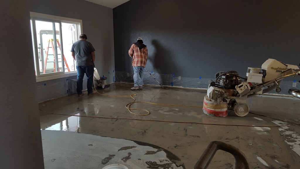 First thing the stain/sealer crew did was grind the surface to a dull finish. Said if they didn't do that the stain wouldn't stick and we'd not be happy. My concrete guy sure was disappointed, he worked hard to get that sheen.....