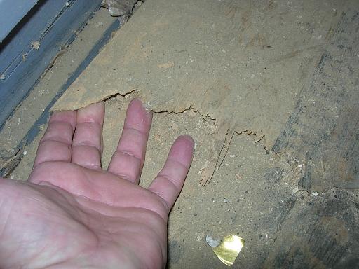 Note the red circle...though maybe not exact, it's close enough. There is a crack in the floor here. Seems it's made of some kind of chipboard (Advantech?).