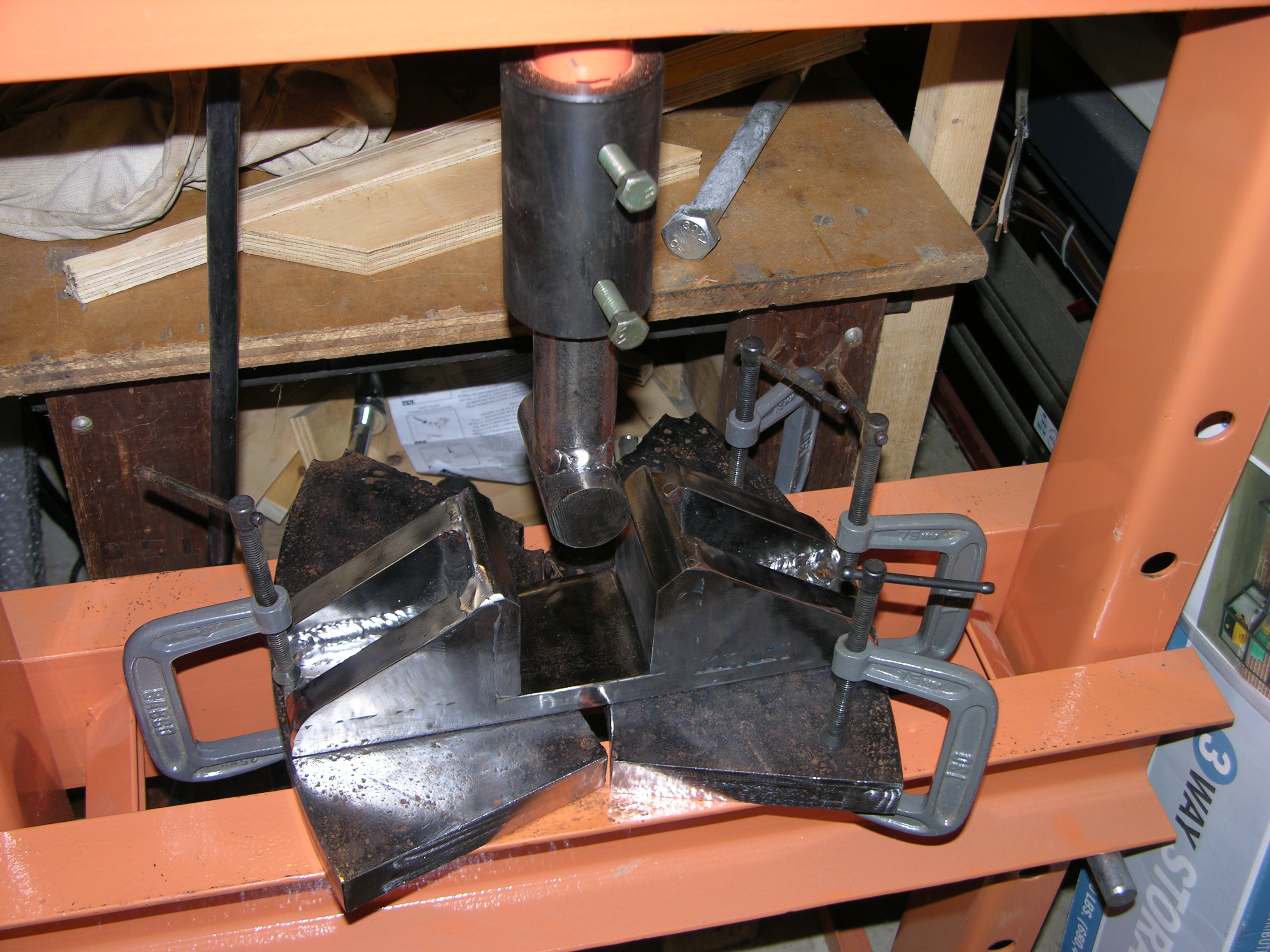 This square tube into square tube is more like a square tube into a rectangle tube as in POST 410> 4th picture? yup should've had that picture of that dramatic episode, what was you thinking, now dont blame it on the heat............One of these (minus the "U" bracket jig) - View attachment 563606 - In my case, it's a 20 ton press - the tubing in question is 3" wide, - 1/2" for 2 quarter-inch walls leaves 2-1/2" for the 2-1/2" tubing that I pushed inside - as you probably found out, the electrically welded SEAM gets in your way. My need was just to beef up the wide tubes so they wouldn't crush, so I used a zip disk and did a small "furrow" down the side of the small tube (it's still1/4" wall, so no biggie) - then I ground a short bevel across the end of the small tube on 2 sides so it'd START a little easier, I lined up my "furrow" with the weld seam on the bigger tube, couple taps with a small (32 oz) hammer, set the whole thing on the press, used that "Tee" pusher in the pic, and held the air on the air/hydraulic jack til it looked halfway there...