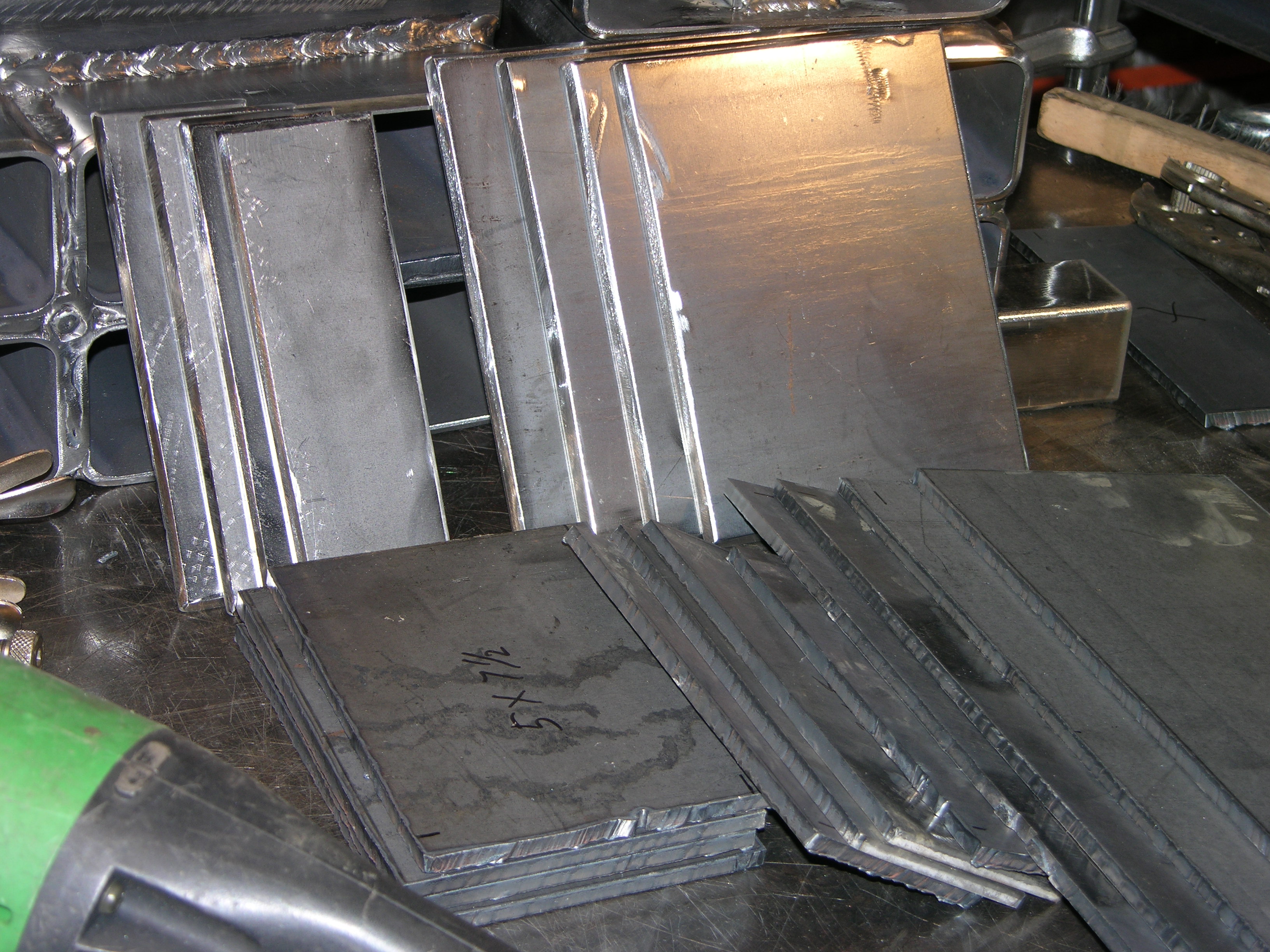 I got all 20 of the 1/4" cap pieces cut today, and 8 of 'em de-glazed, beveled and ready to weld on - my plasma View attachment 563712 cuts 1/4" steel at 60 IPM, which makes it real handy to just lay a ruler along the back edge of the 1" angle I use for a guide - View attachment 563713 ever since my military time I can count seconds accurate within about 1 second per minute, so I just hold the torch against the guide and move it past the inch marks at one per second - works pretty good - View attachment 563714 View attachment 563715 - The ones standing up against the pyramids are the finished ones...