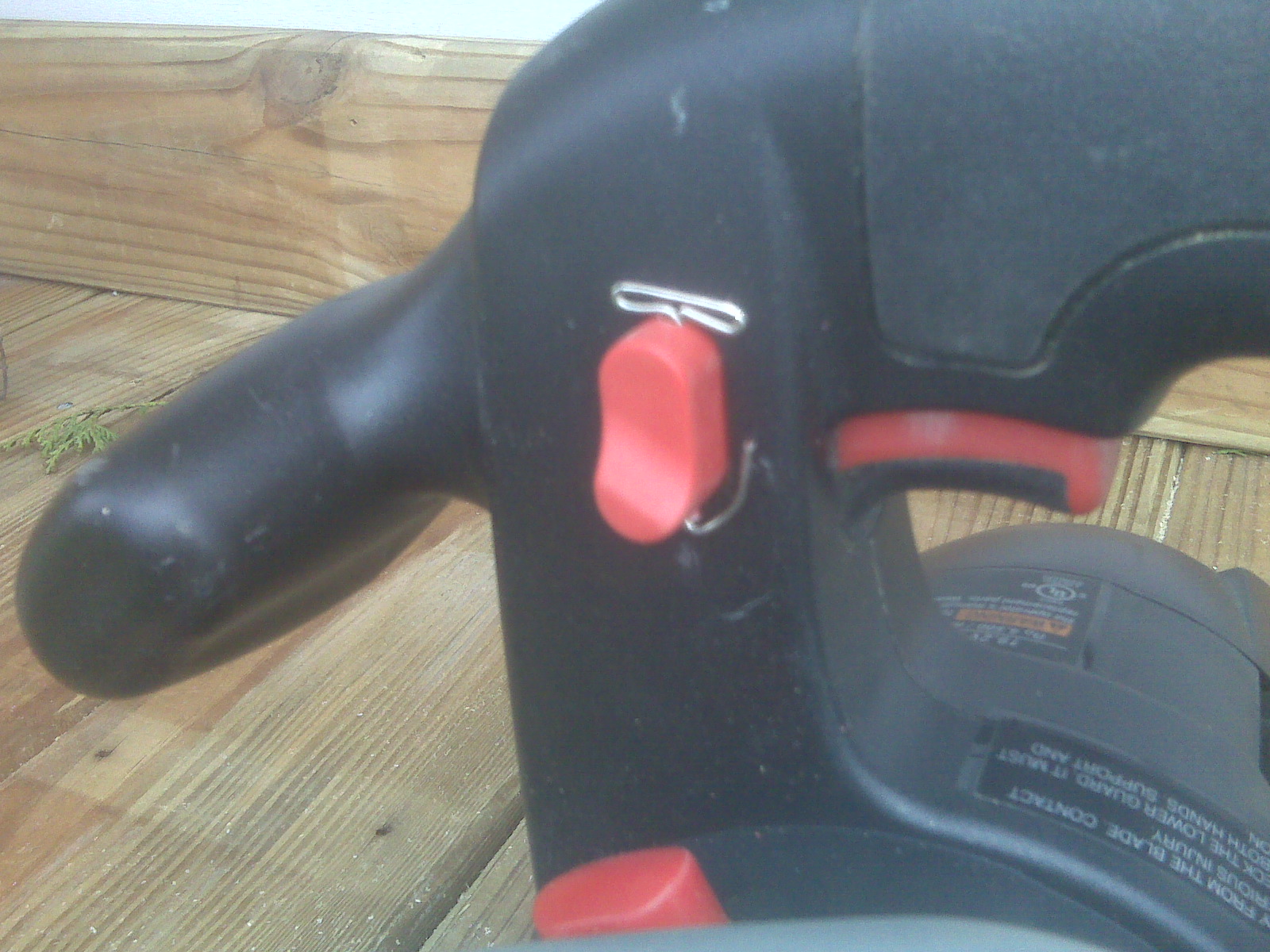 Today I had to stand on a tall extension ladder and cut through sheathing in order to install some new windows. A cordless saw is ideal for this kind of work, with two exceptions: To plunge cut, you need to retract the lower saw guard...hard to do when you want to hold onto the ladder with one hand. Finally thought of using the big yellow spring clip to keep the lower guard retracted. Secondly, for many of the cuts, having to press the red safety lock so I could depress the saw trigger was very hard on my arthritic right hand, so I drilled a tiny hole through the safety lock and inserted and bent a T-pin to hold the lock open. When the job was done, I removed the T-pin again.