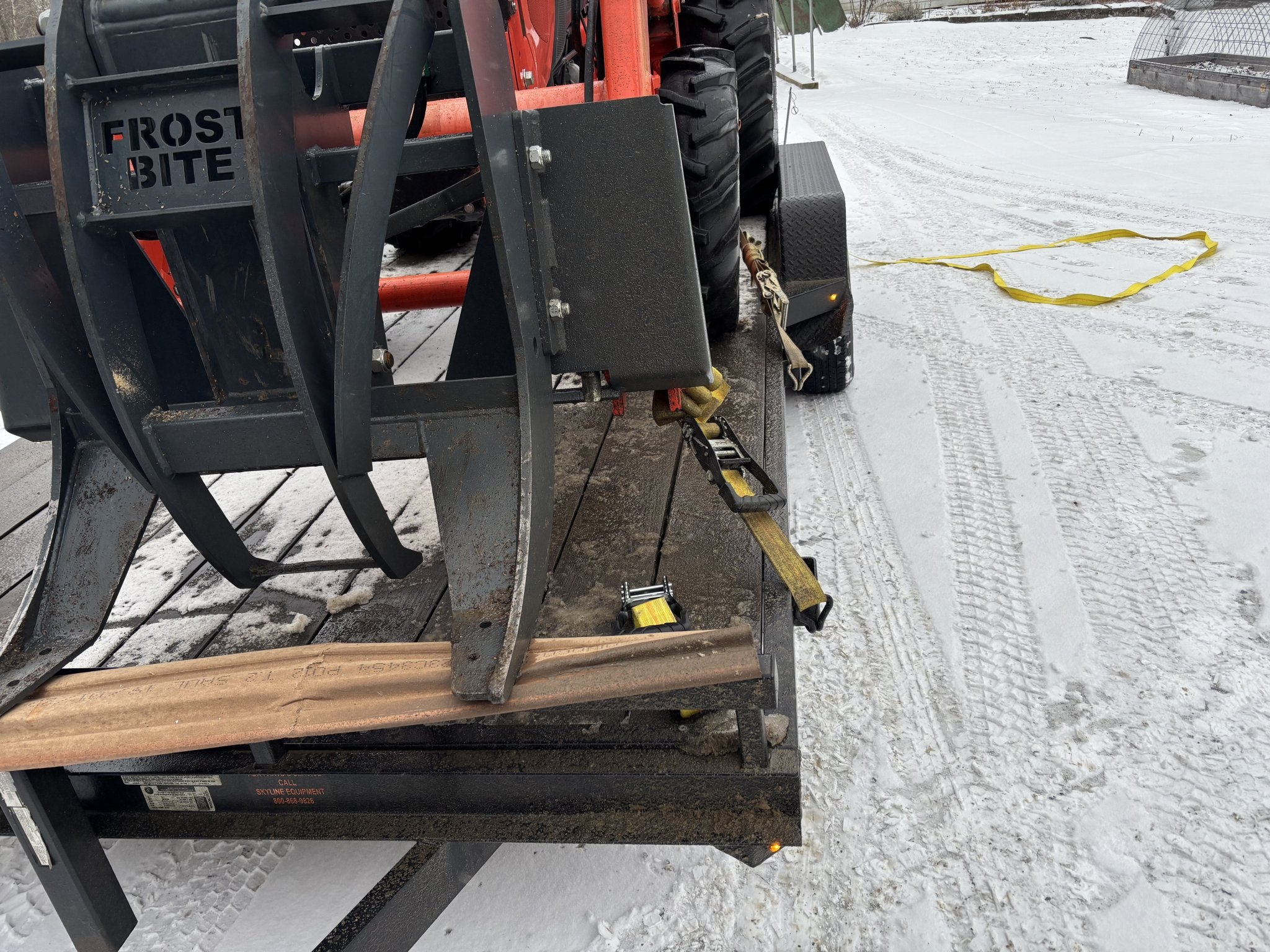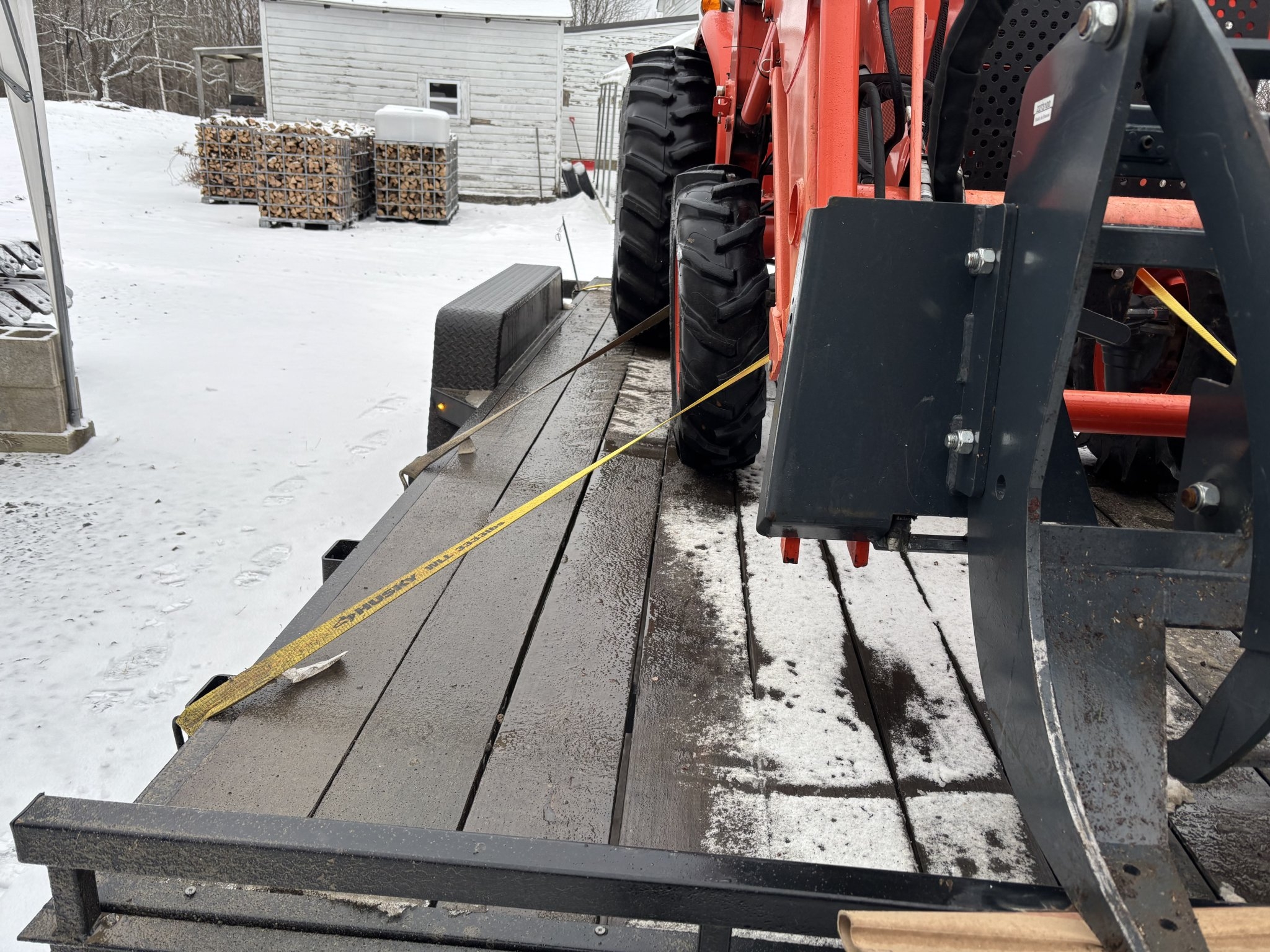 You can use straps if you prefer ... Just be aware of the working load limit (WLL) for example if you have a 5000 Lb tractor, you would need at the very minimum of 2, 2500 WLL rated chains/straps if you went completely from one side to the other with it tying into the tractor in the middle ... However if you secure it like I did mine above, you would need 4 chains/straps with a minimum WLL of 1250 Lbs ... Plus the 2 to put one over the loader, and another over the BH, or whatever rear attachment you have ...