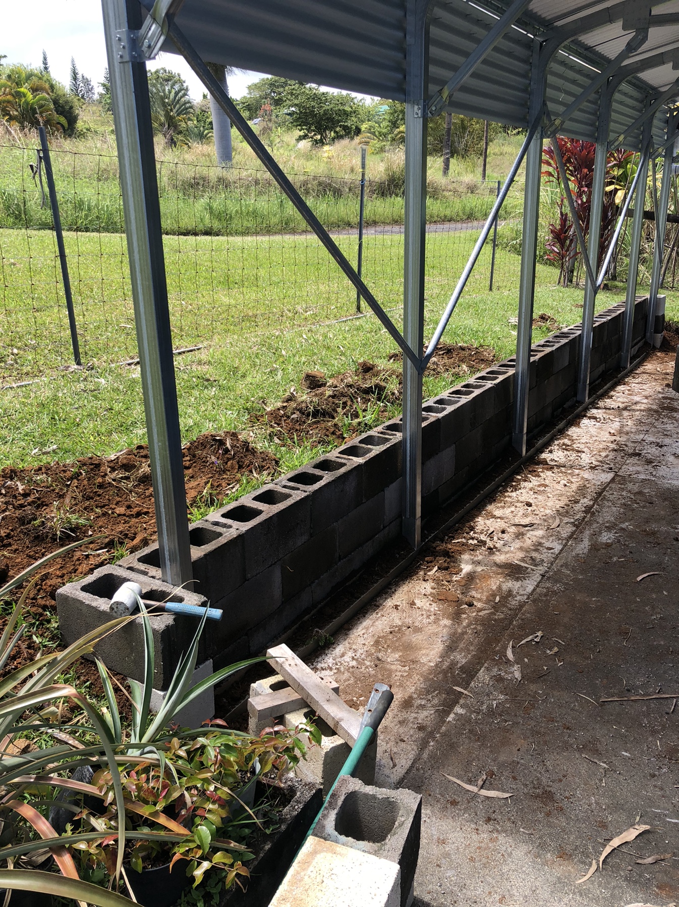 Got the blocks stabilized with 12 3+ft lengths of metal fence post then filled all the blocks then backfilled. Last sheets of metal installed.