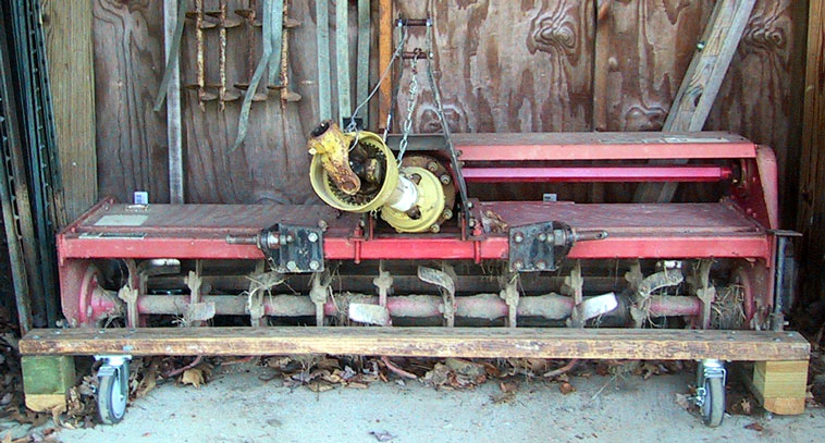 When I detach my 5' LandPride tiller and set it on the pallet, inevitably it tips over which makes it really hard to re-attach it. Yes, I put the side foot down, but it's too short--pretty useless. I end up having to wrestle it to get it reattached, cursing a lot, and not having a ton of upper body strength, it's really hard.