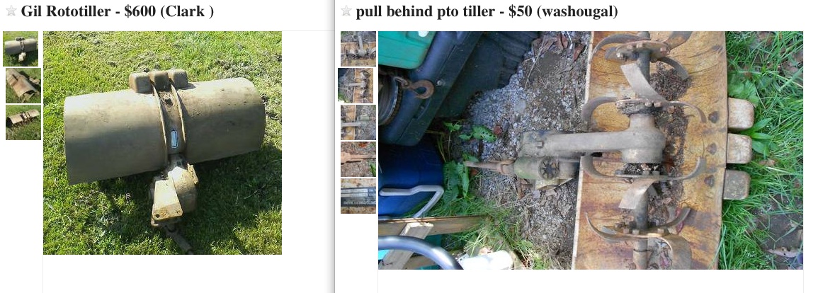 Looking at CL this morning, I thought I saw the same tiller twice, so I found both ads. I think this is the same (or nearly) tiller attachment in both ads. Quite a price difference! Bruce