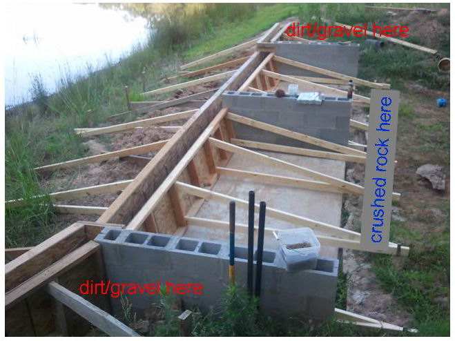 Yep, maybe crushed rock or something similar in the middle. I was wondering about filling with dirt between the outside wing walls and the concrete blocks. Hydrostatic pressure is gonna push really hard against the cinder blocks if Eddie gets a big 4"-5" rain and that spillway is flowing pretty fast. I'm just not sure how Eddie plans to handle the transition between the spillway and the earthen dam so water stays inside the spillway and doesn't erode around it. Eddie has the width of a 2x4 above the main spillway for the wings, but what if the water tops this?